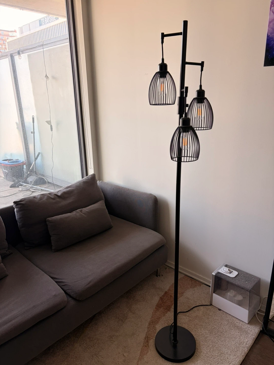 This black floor lamp has three adjustable lights with a caged design. It's a stylish addition to any room. The lamp is about 5.5 feet tall.