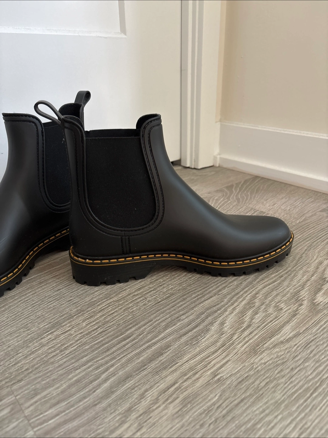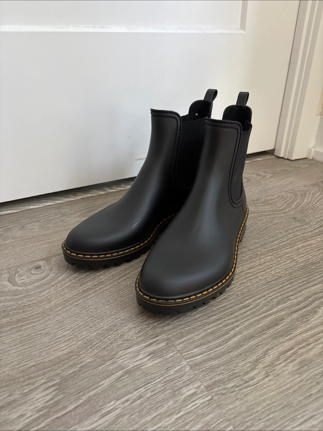 These rain boots are perfect for keeping your feet dry and stylish! They're in perfect condition (only wore once) and ready for a new home. The size is 41 (equivalent of 10US) and they're a sleek black colour. These boots are super versatile and can be dressed up or down!