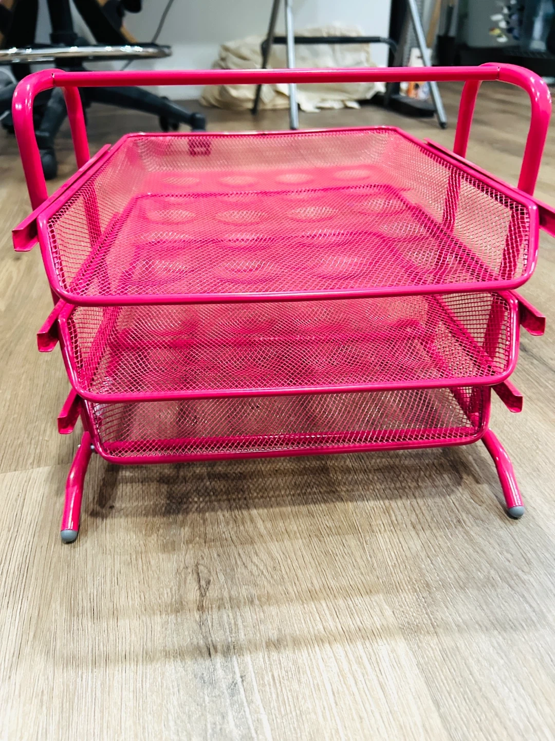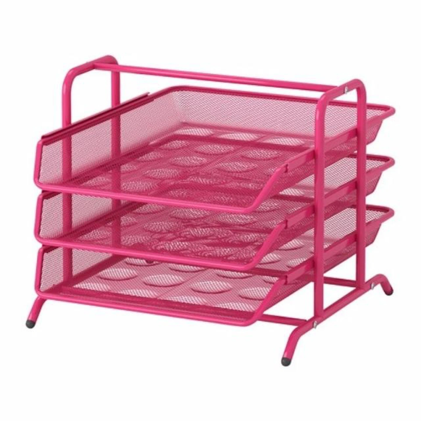 This is a pink, three-tier mesh desk organizer tray. It's made of metal and perfect for keeping your workspace tidy. It includes three sliding drawers for easy access to your papers.
