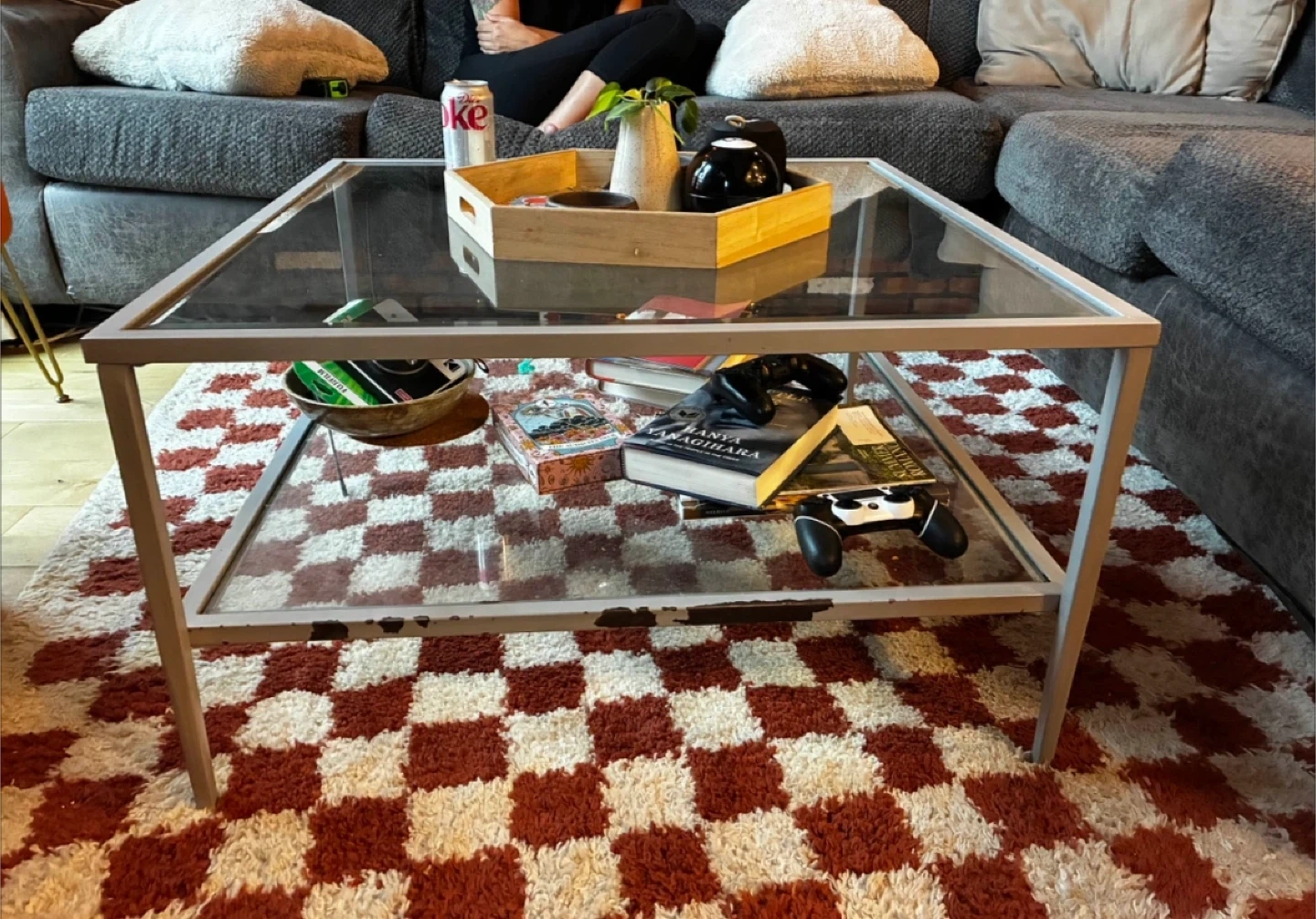 Selling a glass top coffee table! Good condition see pictures for scatches and paint that came off the frame