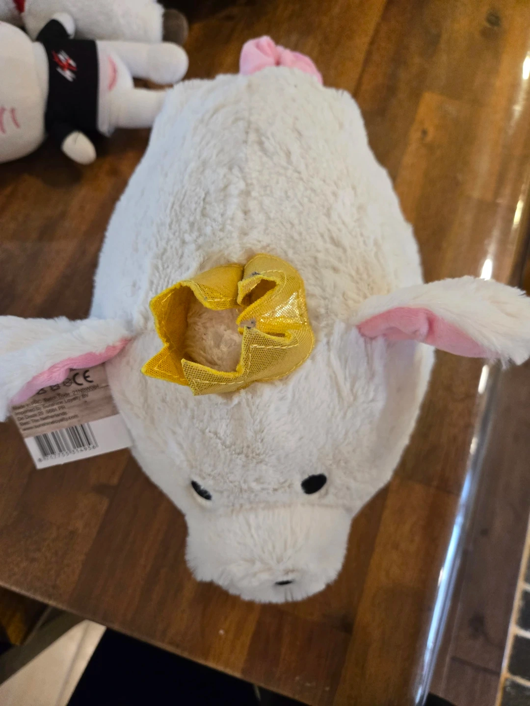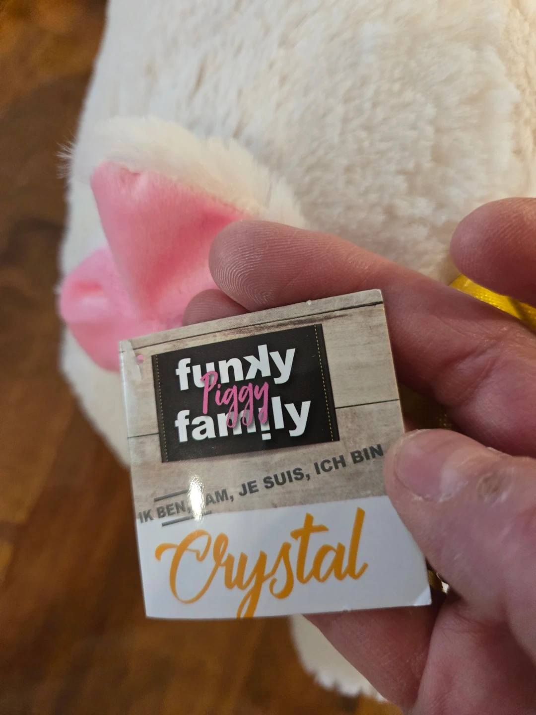 This is the Funky Piggy Family "Crystal" plush toy. It's soft and fuzzy with pink ears and a gold crown. It's a cute and cuddly companion.