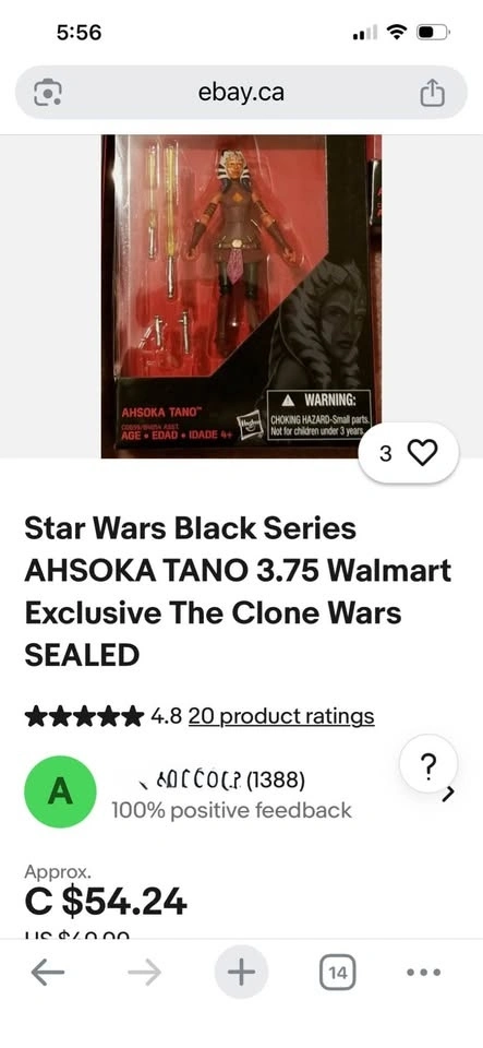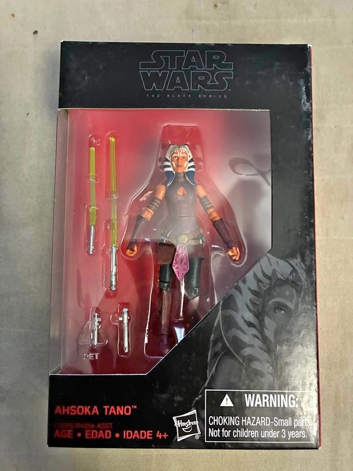This is a Star Wars The Black Series Ahsoka Tano action figure, sealed in its original box. It features premium deco and multiple points of articulation. This is the 3.75-inch scaled version. Includes two lightsabers and two lightsaber hilts. It's a 2016 exclusive release from the Black Series line. Sells for +$40 in line (see photos).