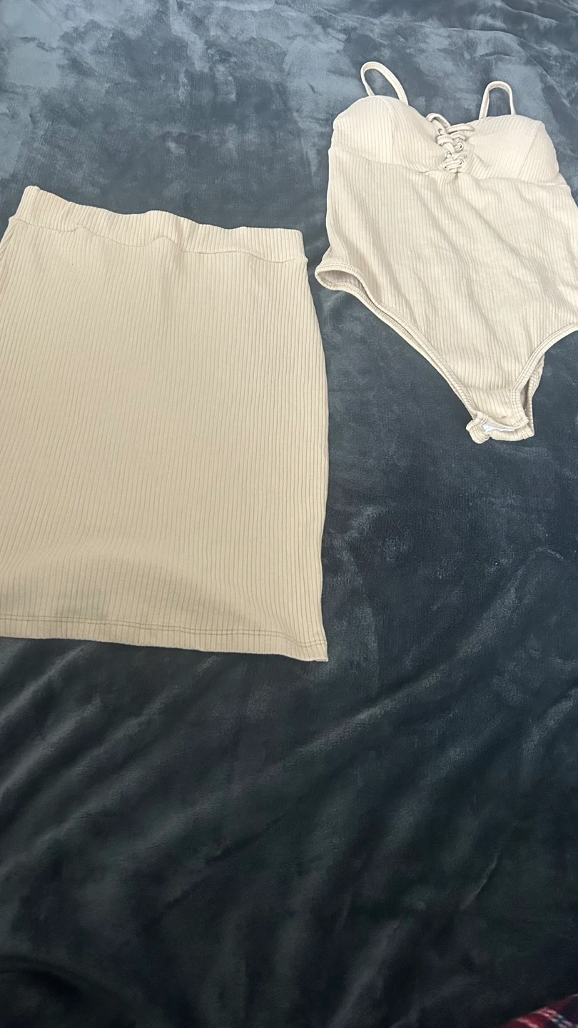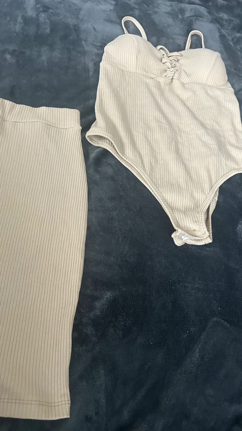 Selling a matching beige bodysuit and skirt set. The material is ribbed and stretchy, and both pieces are in great condition. Perfect for a night out or a casual day!