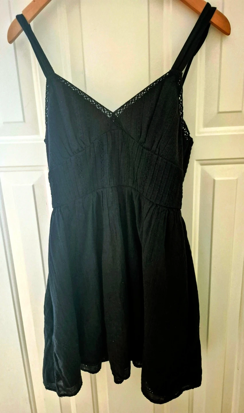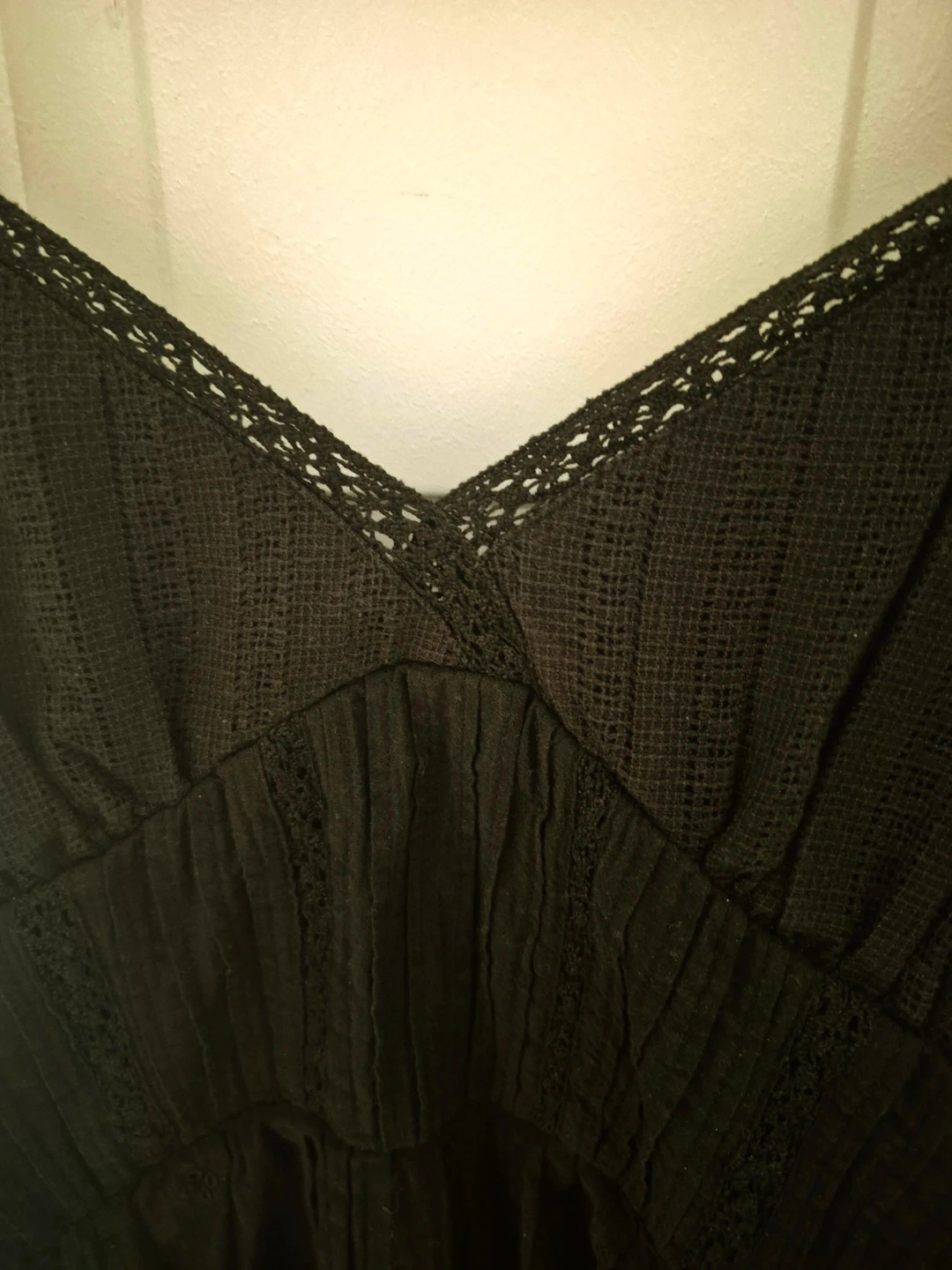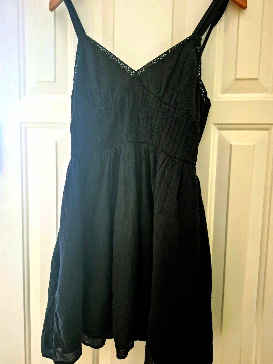 Cute black sundress with lace trim detailing! It's perfect for a casual summer day. The dress has adjustable straps and a comfortable fit.