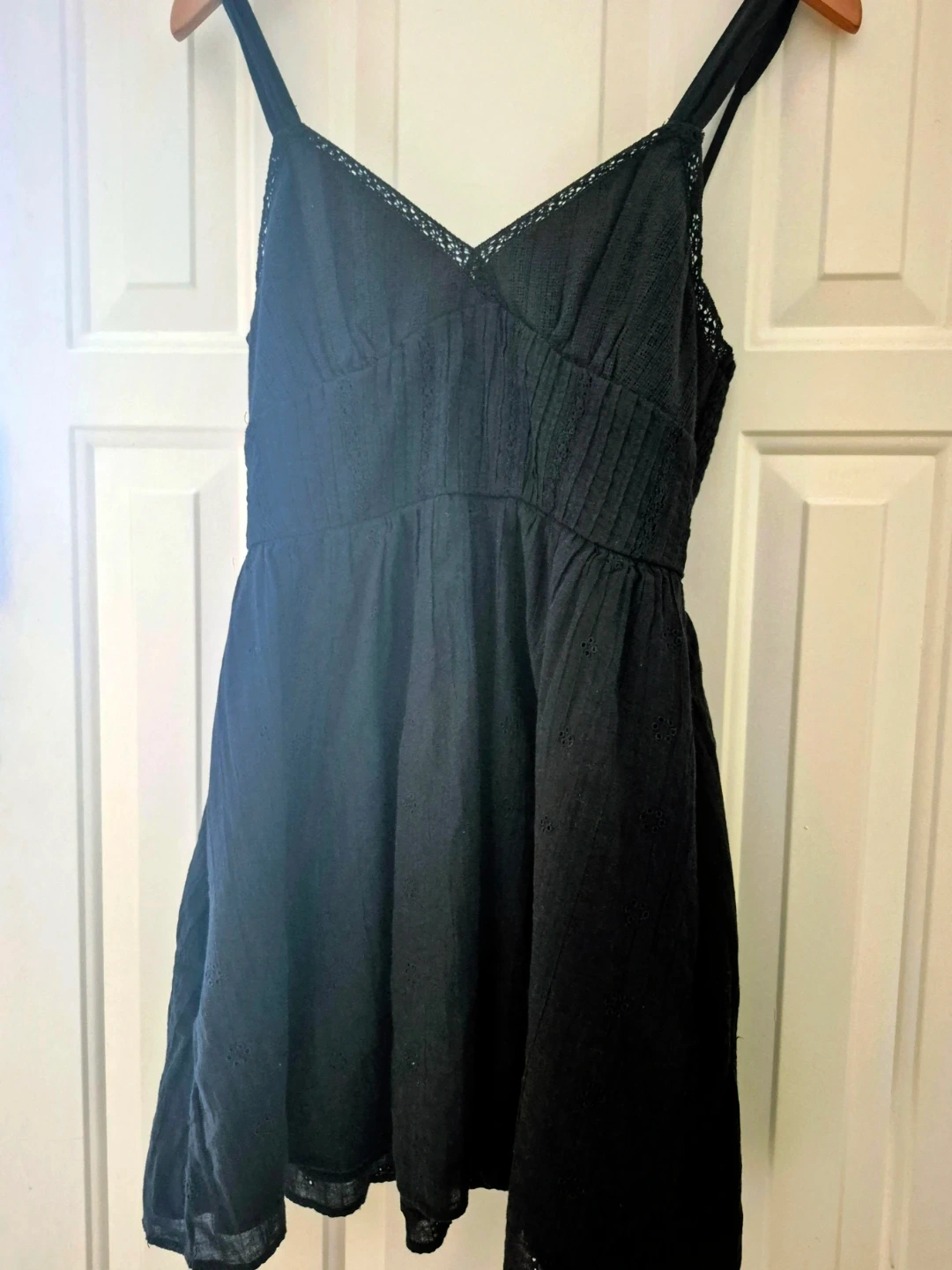 Cute black sundress with lace trim detailing! It's perfect for a casual summer day. The dress has adjustable straps and a comfortable fit.