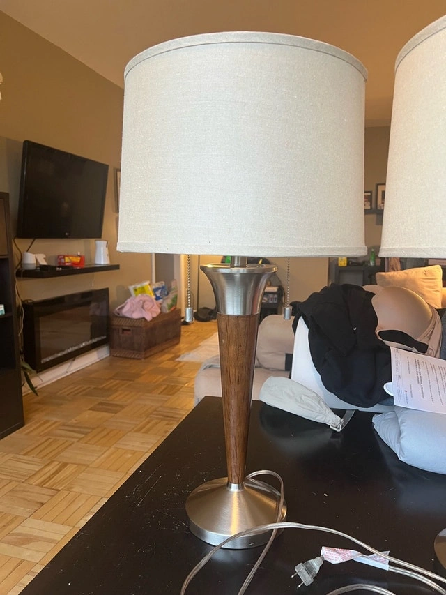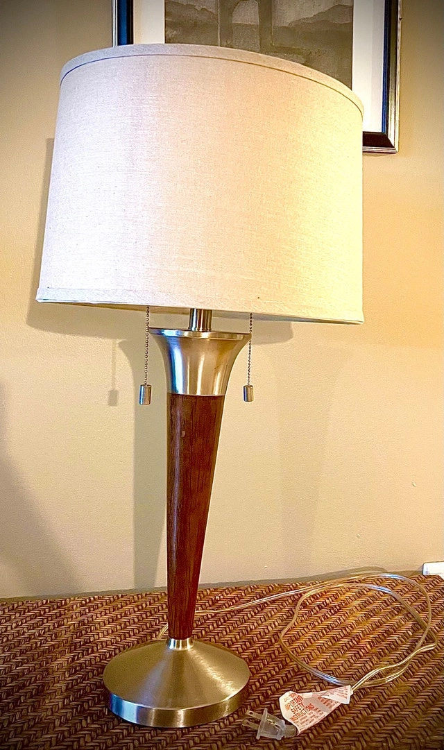 Mid-century modern Laurel brass table lamp, showcasing a sleek wood and brass design with a neutral-toned shade. This lamp combines vintage charm with modern functionality, perfect for adding a touch of retro elegance to any room. This lamp is used, so expect some light wear. Features: Elegant wood and brass construction, Classic mid-century modern design, Neutral-toned lamp shade included. Selling each for $65 or both for $110. If you're reading this, yes, it's still available!
