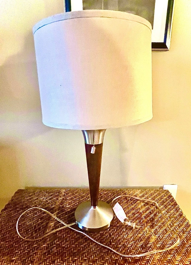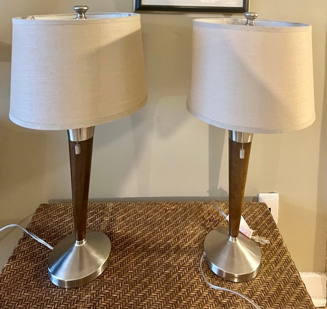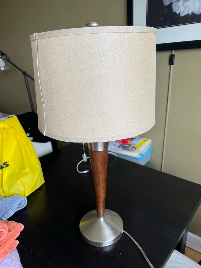 Mid-century modern Laurel brass table lamp, showcasing a sleek wood and brass design with a neutral-toned shade. This lamp combines vintage charm with modern functionality, perfect for adding a touch of retro elegance to any room. This lamp is used, so expect some light wear. Features: Elegant wood and brass construction, Classic mid-century modern design, Neutral-toned lamp shade included. Selling each for $65 or both for $110. If you're reading this, yes, it's still available!