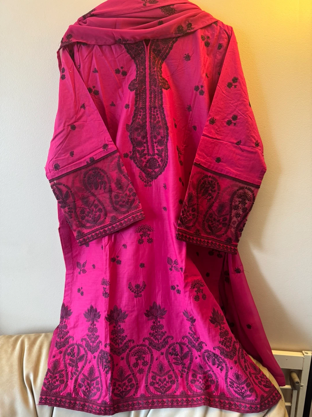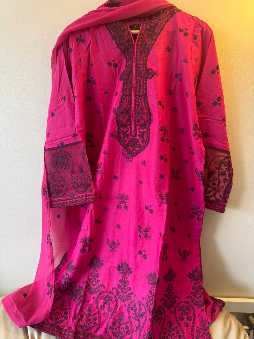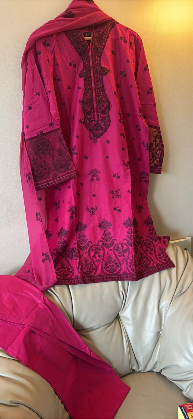 This is a bright pink kurti with intricate dark embroidery. It comes with a matching dupatta and pants. The fabric feels lightweight and breathable. Perfect for cultural events or everyday wear!