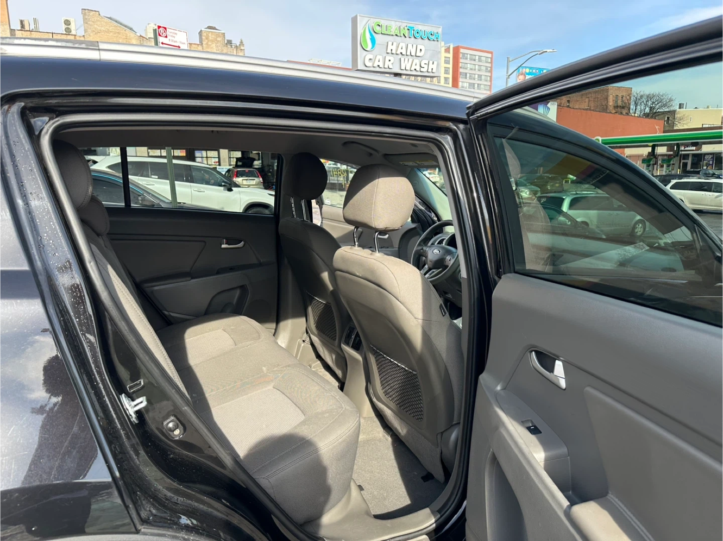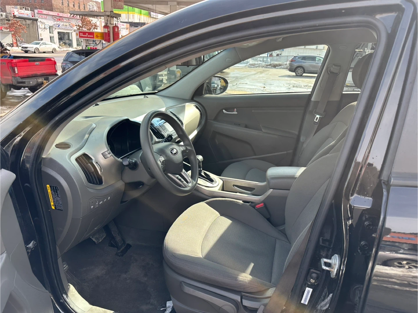 Black 2014 Kia Sportage EX with gray cloth interior. It's powered by a 2.4L GDI engine. Odometer shows 115,00 miles. Clean interior and engine bay.