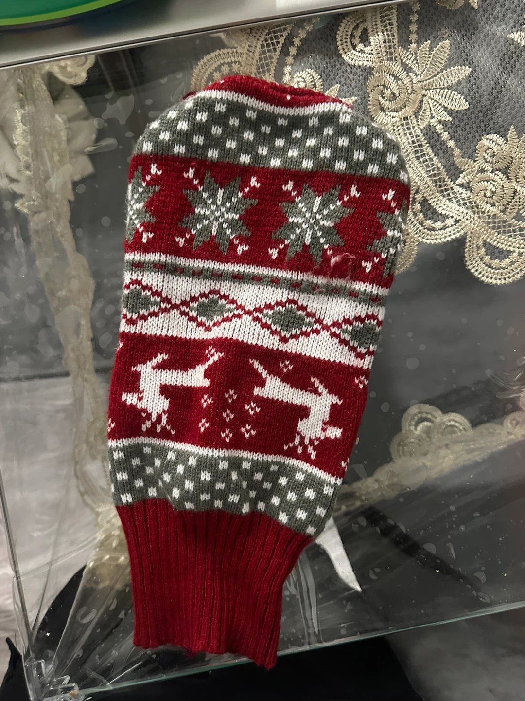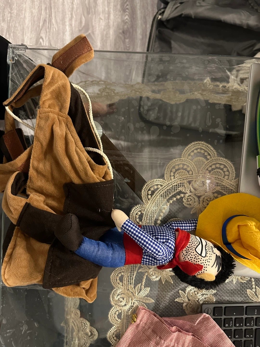 Includes a red and black buffalo plaid dog coat with a sherpa lining, a green dog raincoat with a hood, a red and white fair isle dog sweater with reindeer, and a denim overall set with a striped hoodie. There's also a cowboy doll costume.