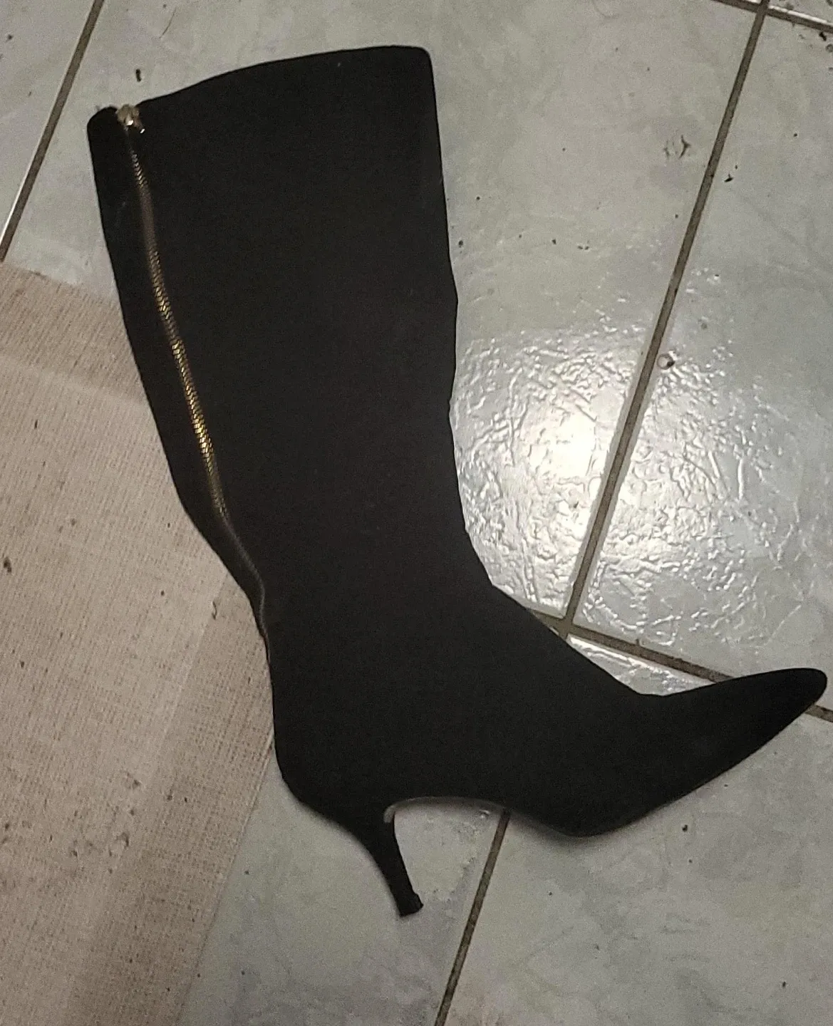 Knee-high boots in black. Features a side zipper for easy wear and a pointed toe with a stiletto heel. These boots are made from a soft, suede-like material.