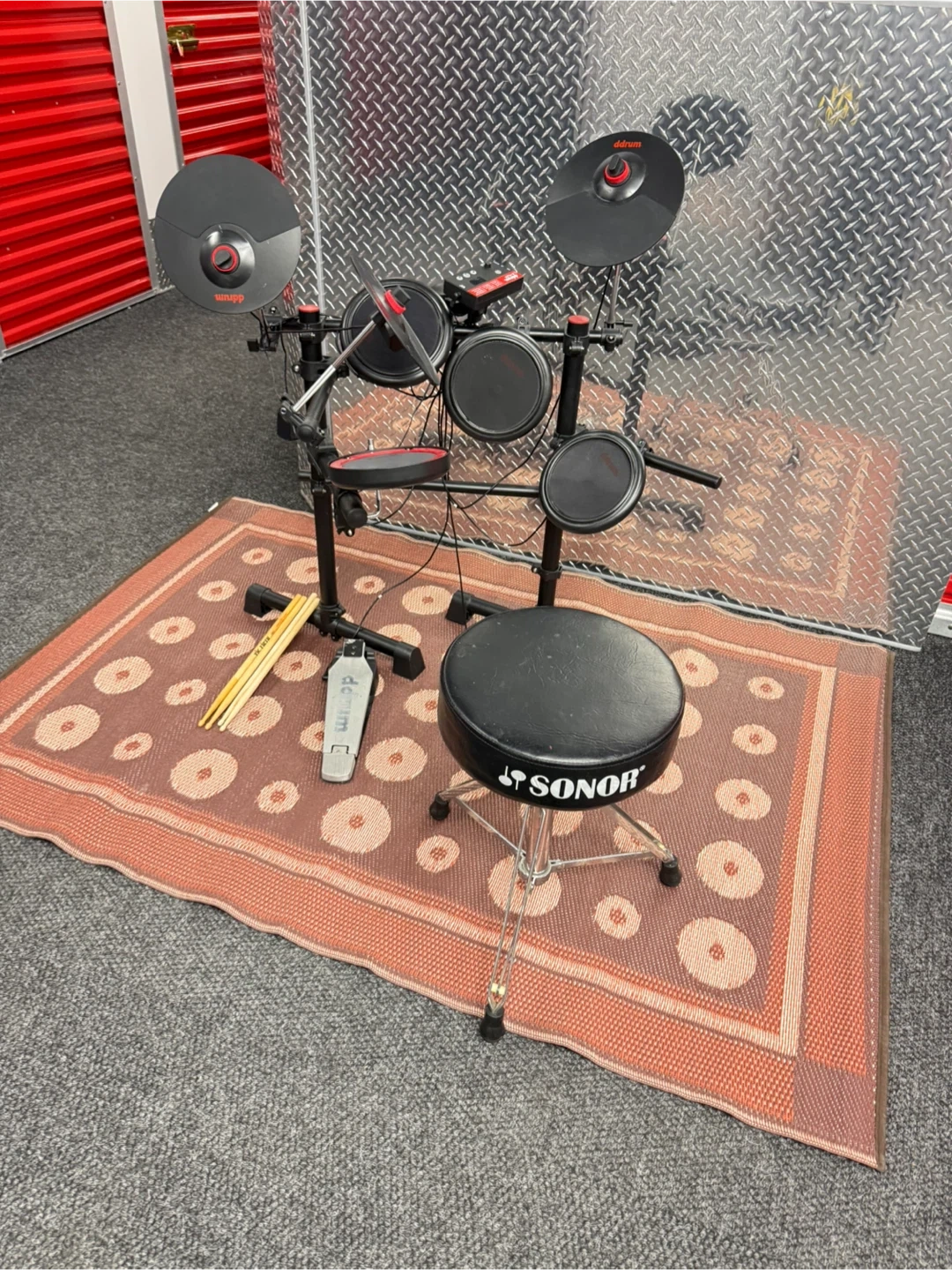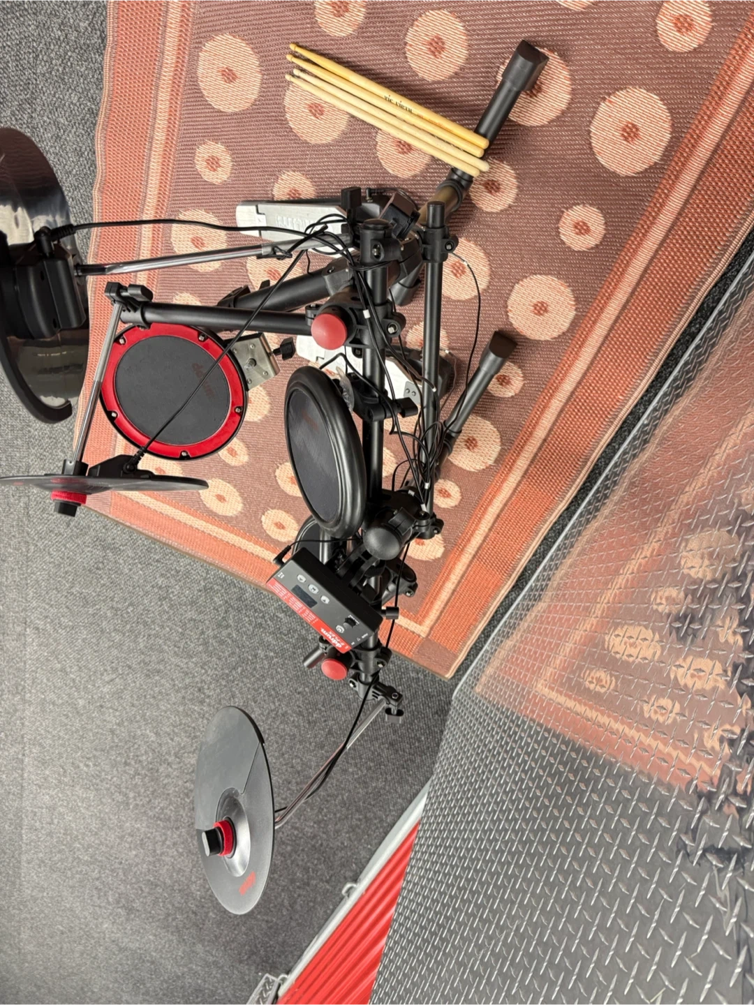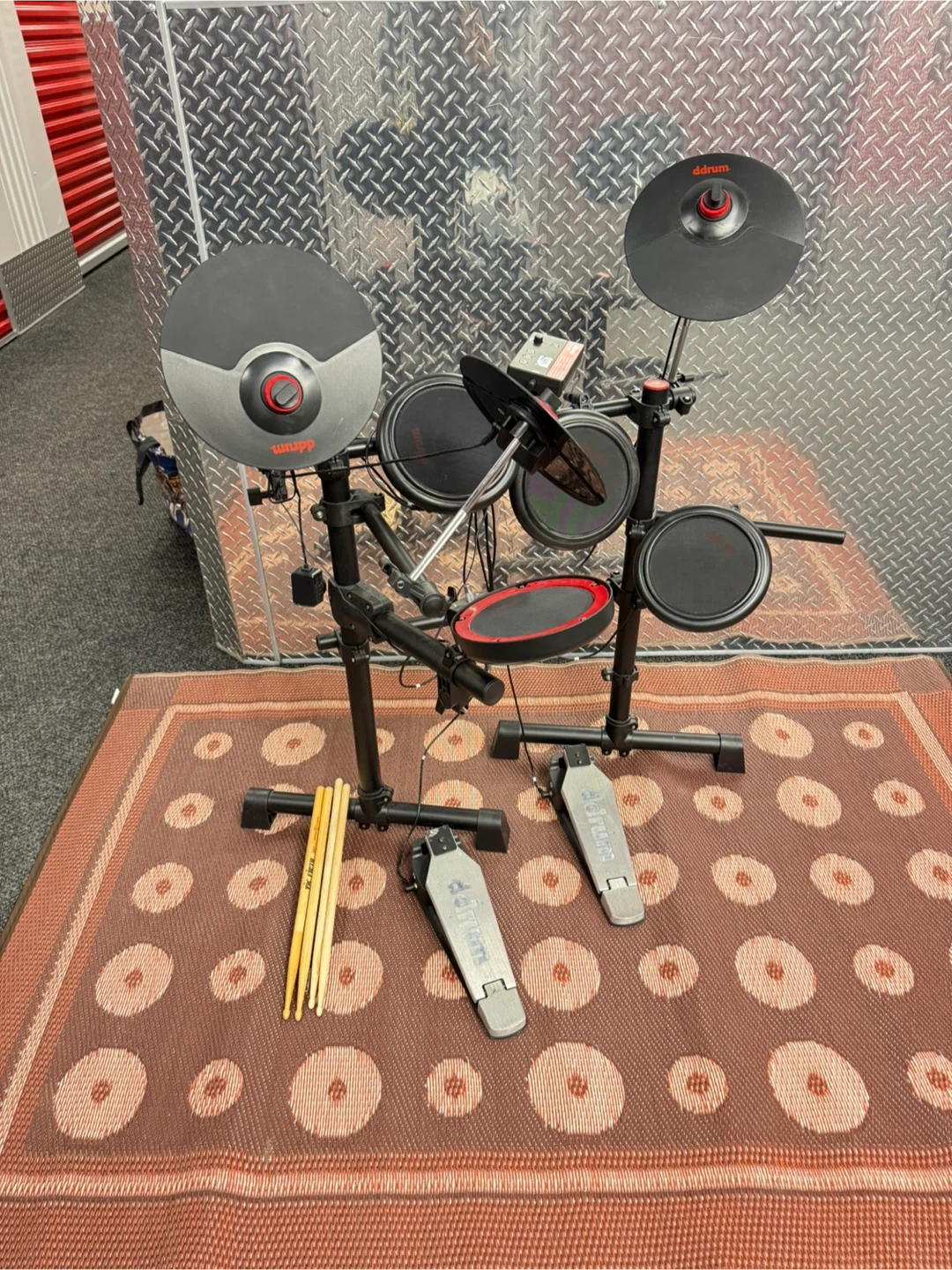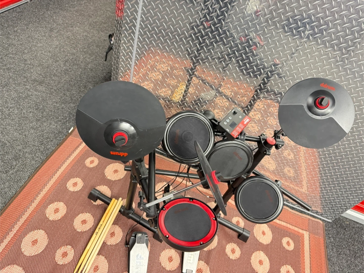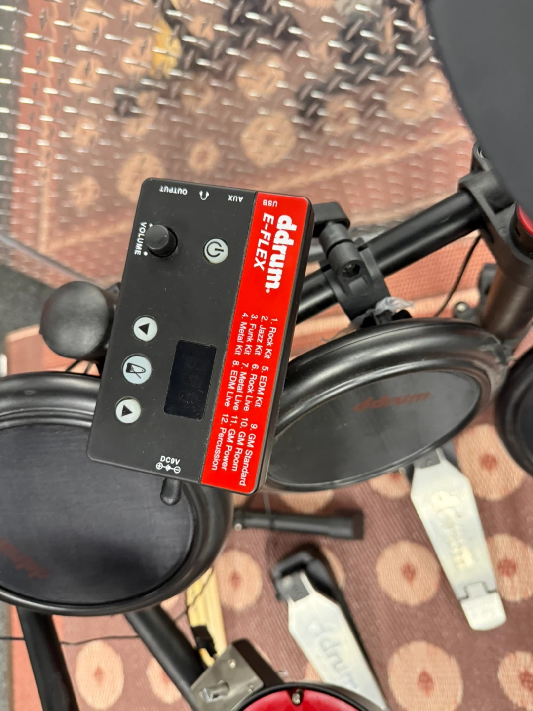 This is a ddrum E-FLEX electronic drum set. It comes with drumsticks. It includes various drum kits and sounds, such as Rock Kit, Jazz Kit, and GM Standard.