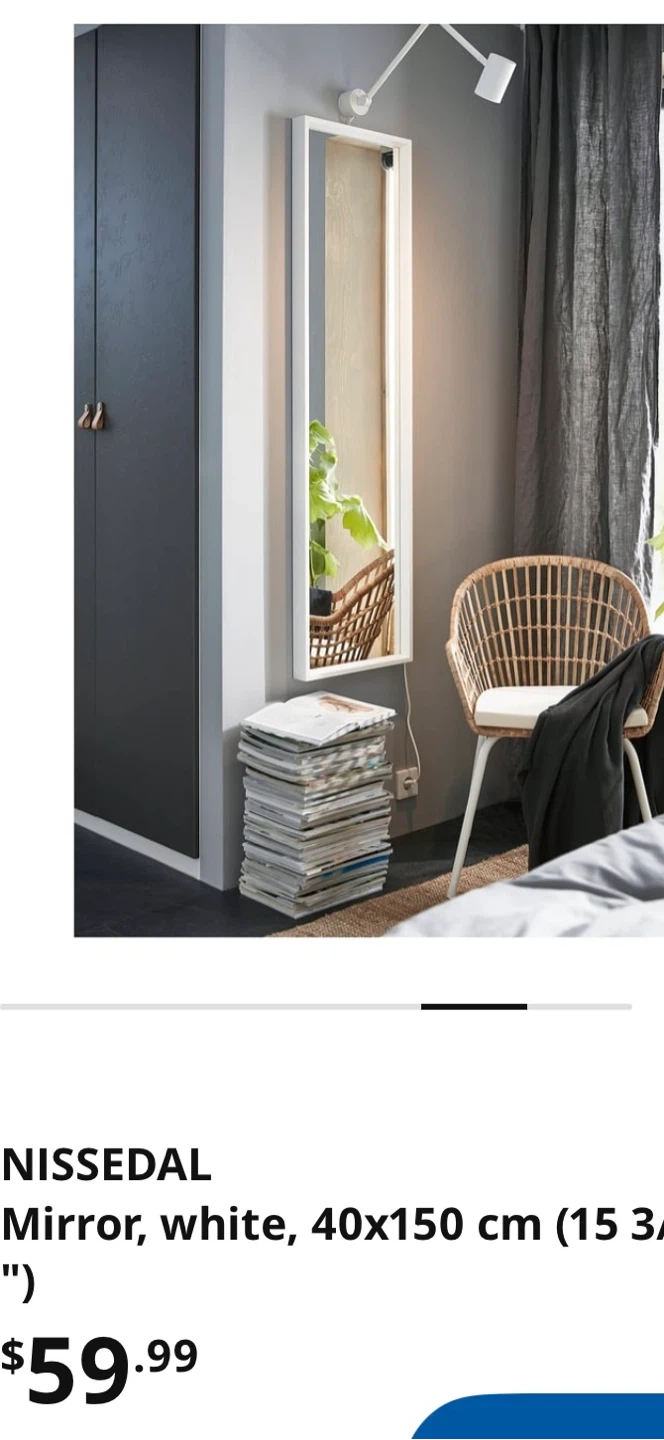 This IKEA NISSEDAL mirror is white and measures 40x150 cm. It's a full-length mirror that can be hung on a wall. It provides a clean, modern look to any room.
