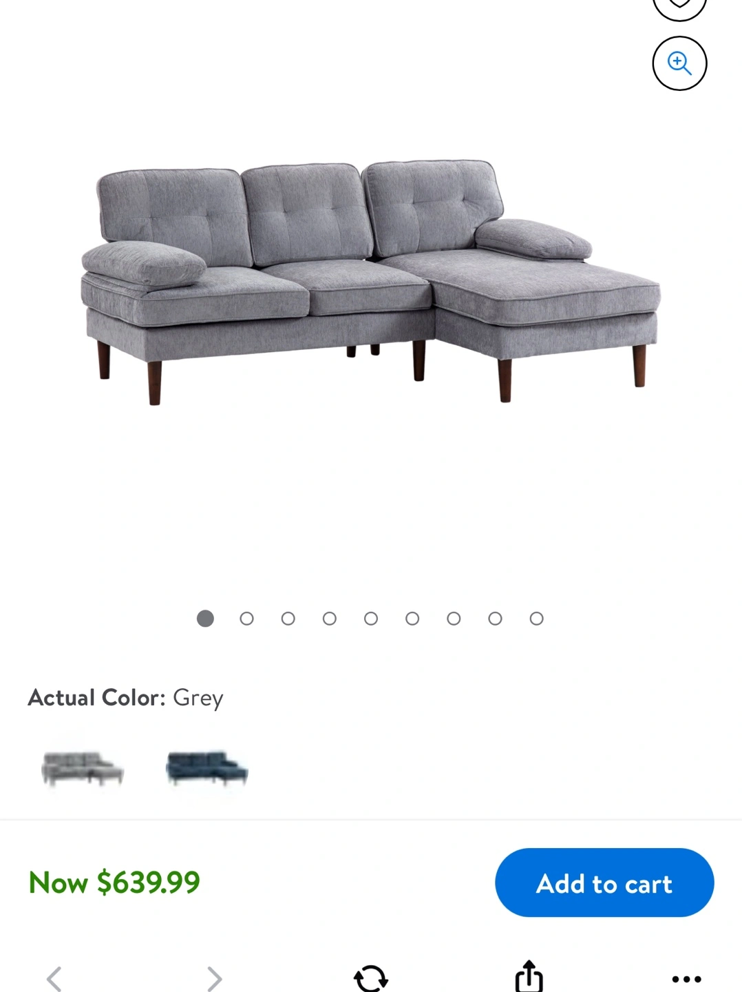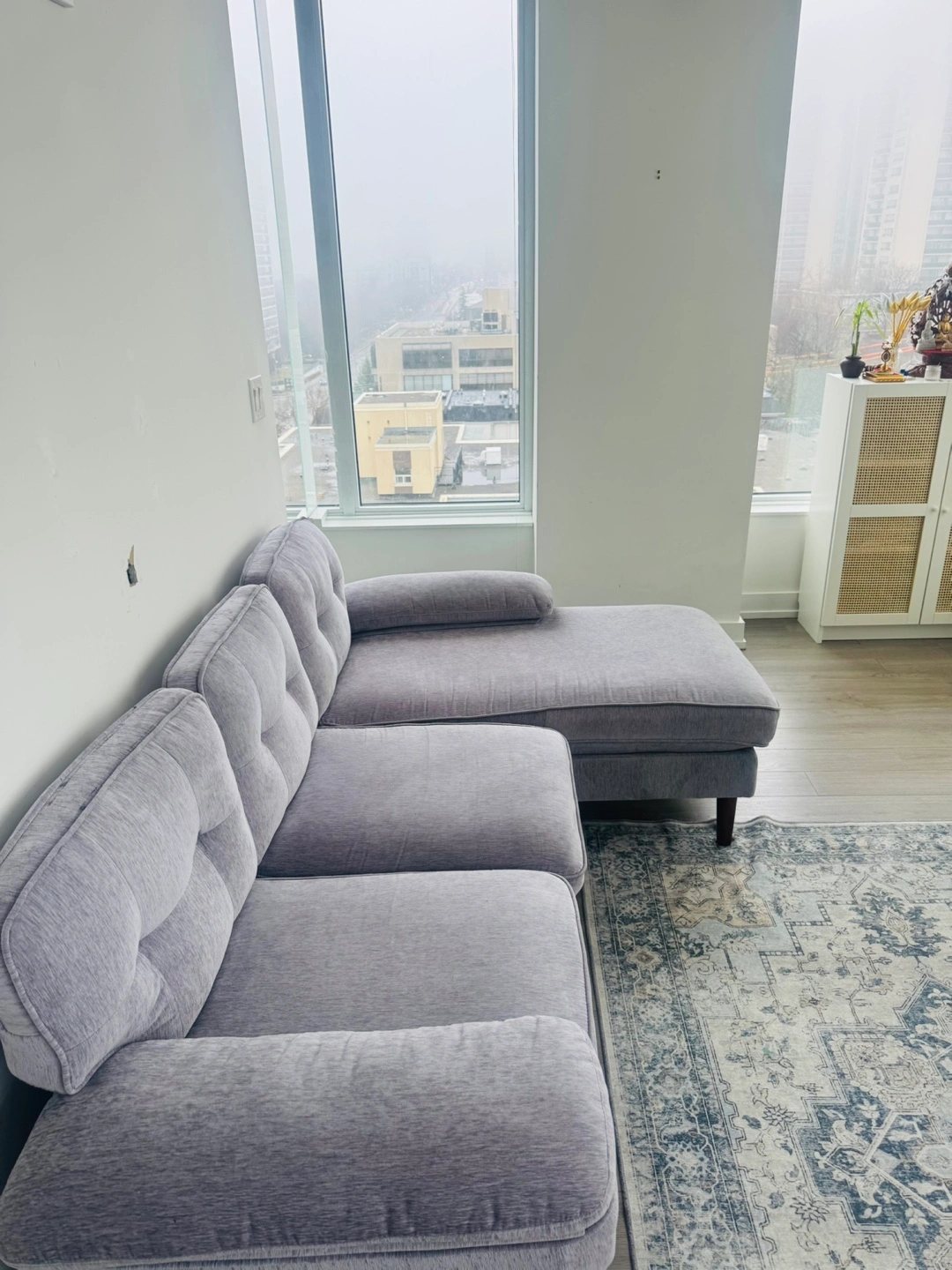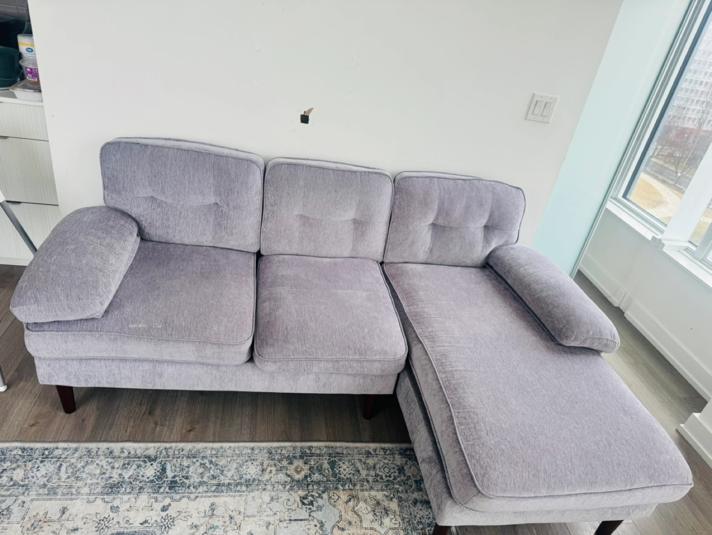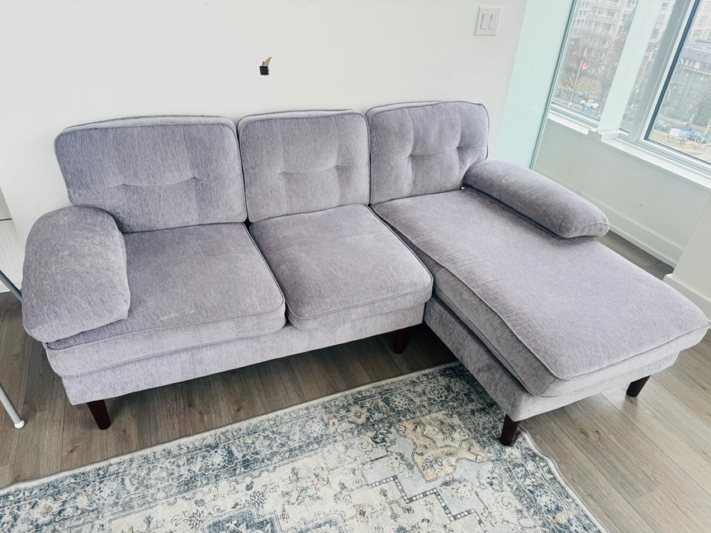 Comfortable grey sectional sofa. Features a chaise lounge. Wooden legs. Chenille fabric. Used for 7 months and in good condition. Selling because moving out of town.