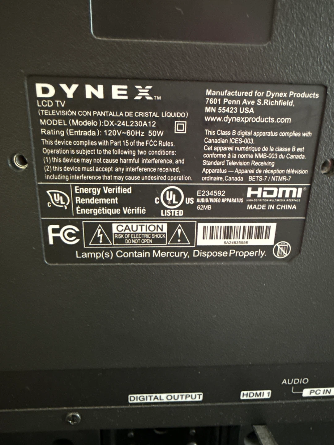 Selling a DYNEX 24" LCD TV, model DX-24L230A12.