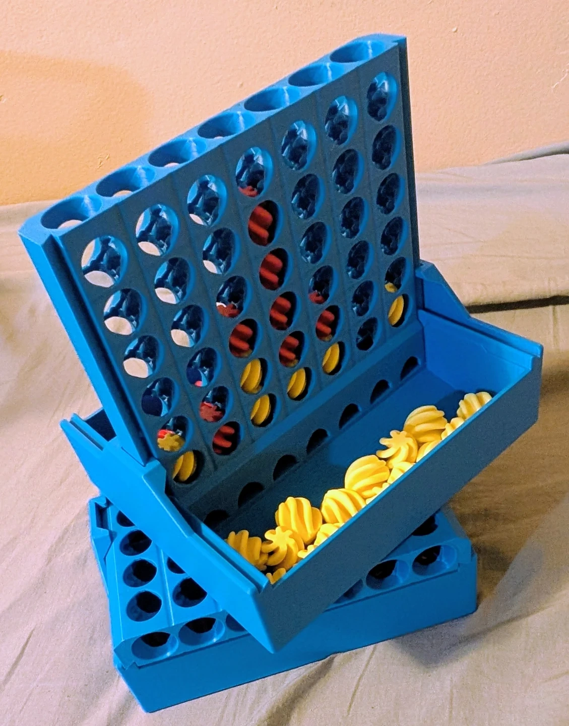 This 3D printed blue Cascade Connect game features a self-sorting mechanism for Connect 4 pieces. It comes with red and yellow discs for gameplay. It's a fun game for two players. You can also travel with it!