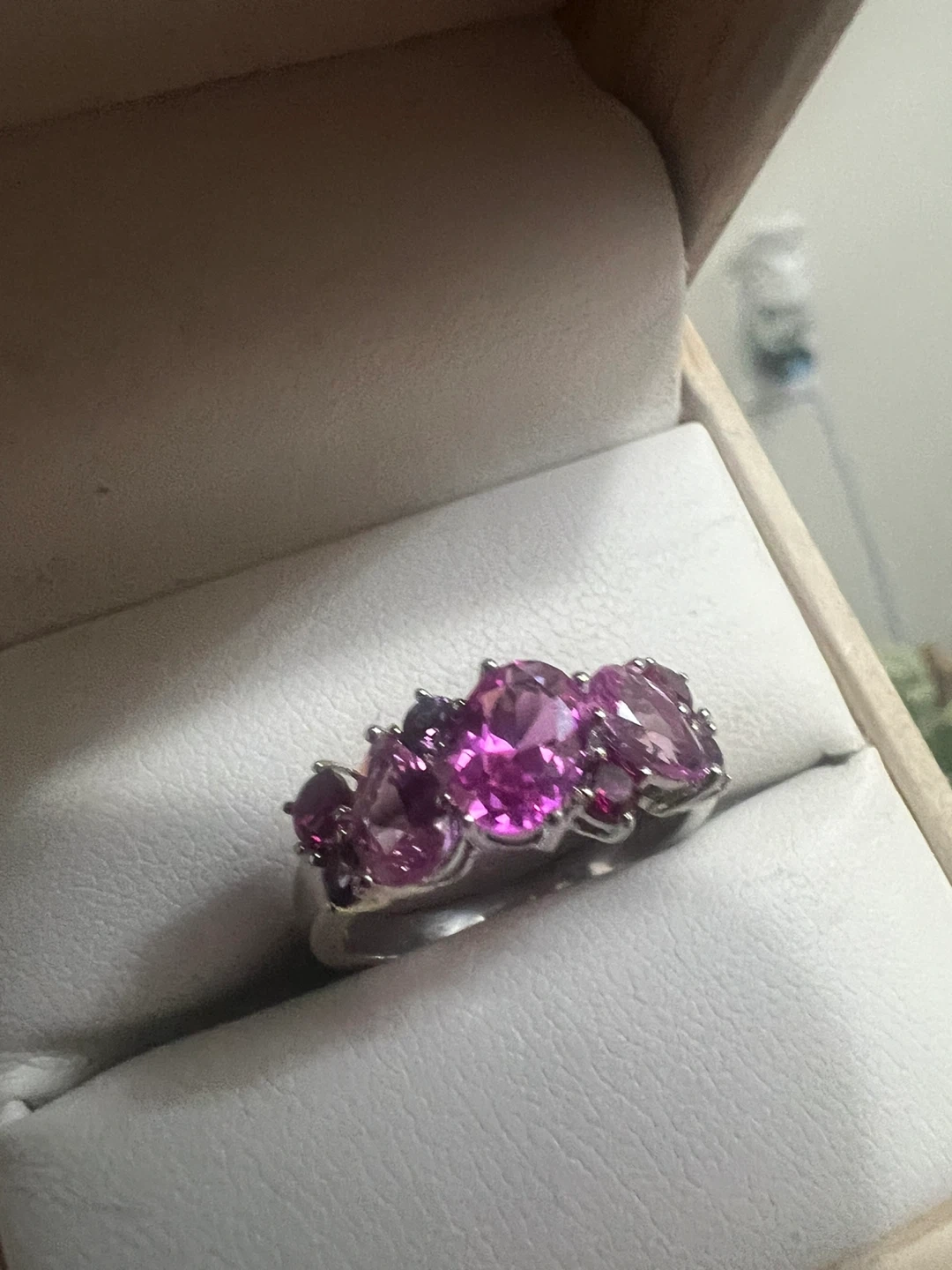 A beautiful ring featuring a row of pink topazes set in 925 silver band. It's a lovely piece for any jewellery collection. This ring comes in a protective box.