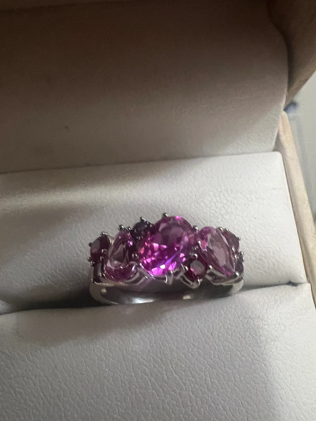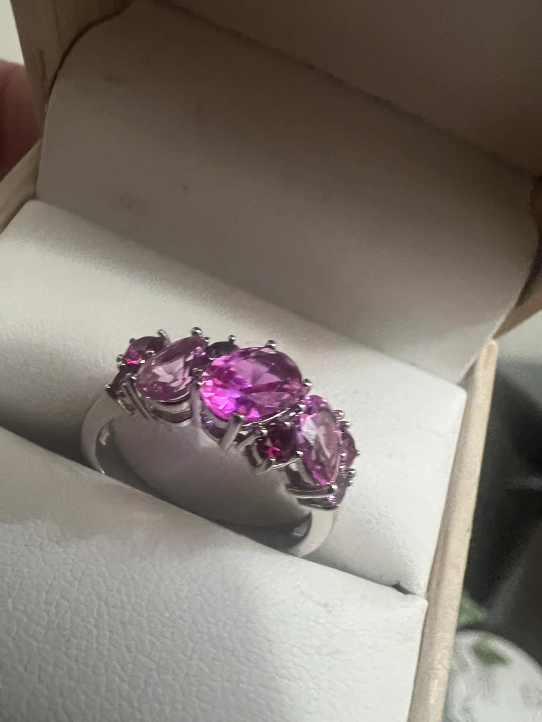 A beautiful ring featuring a row of pink topazes set in 925 silver band. It's a lovely piece for any jewellery collection. This ring comes in a protective box.