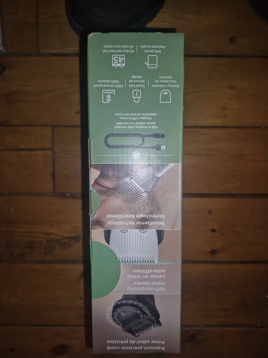 This Philips All-in-One trimmer is a 23-in-1 grooming tool from the 7000 series. It comes with self-sharpening metal blades and BeardSense technology. The trimmer is 100% waterproof and features a 45-minute run time with a 3-hour charge, plus a USB charging cable is included.