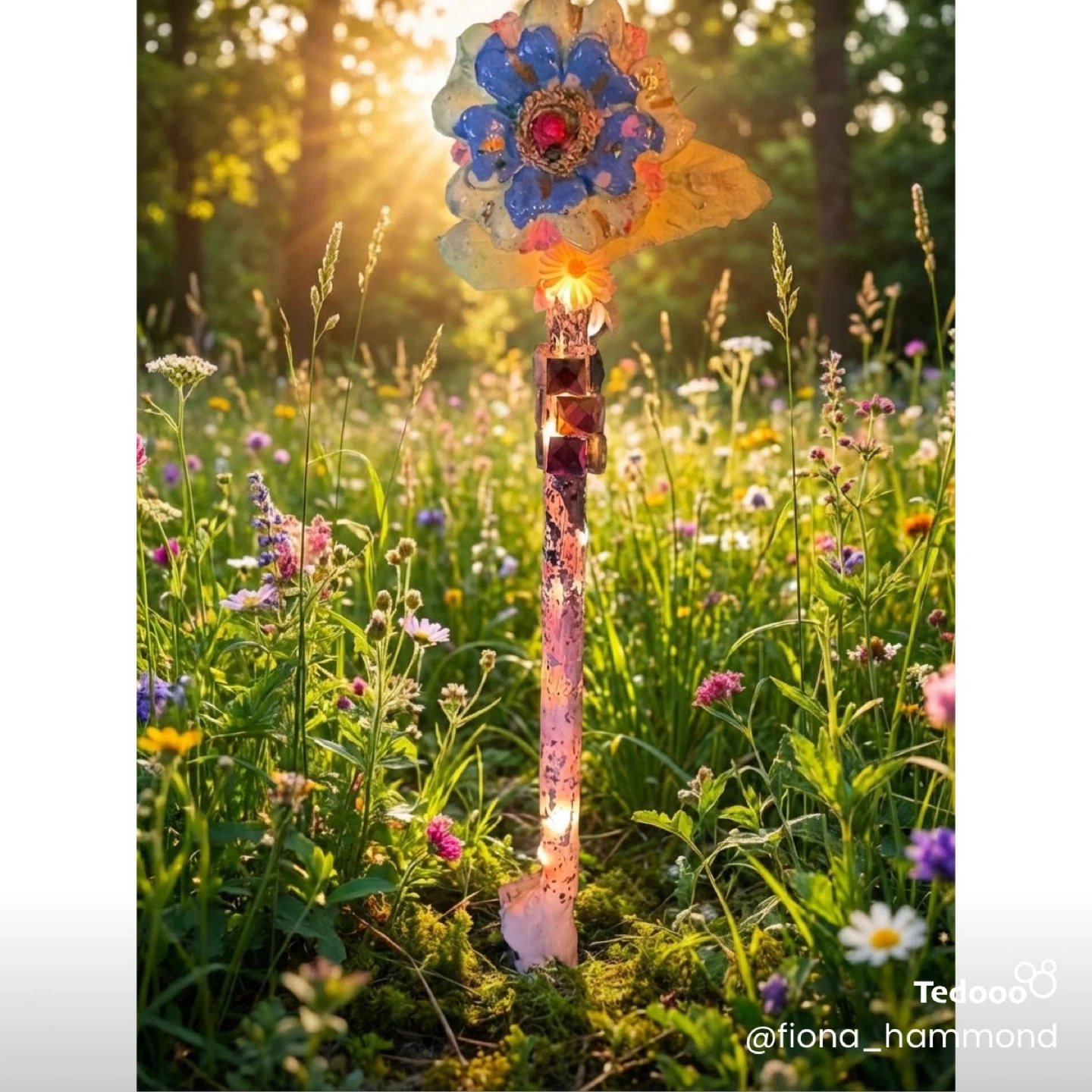 This unique, handmade wand features a decorative floral design and embedded lights. It's approximately 15 inches long and made from various craft materials. This piece adds a whimsical touch to any room, party or festival.