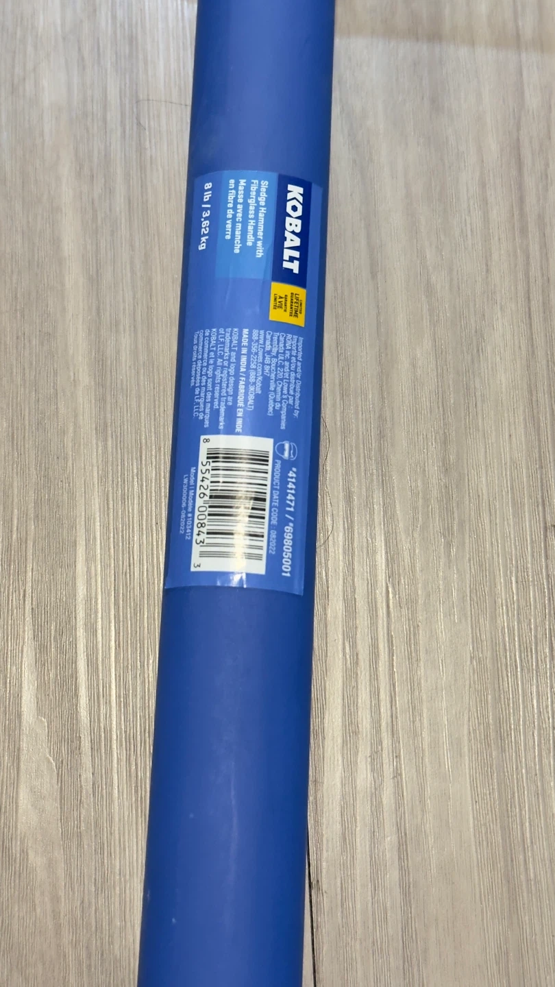 This Kobalt sledge hammer is forged from fine grain high carbon steel. It has been induction hardened and tempered. Cutting edge shaping polished and ground. Fitted with a more durable fiberglass handle and an ergonomic rubber grip.