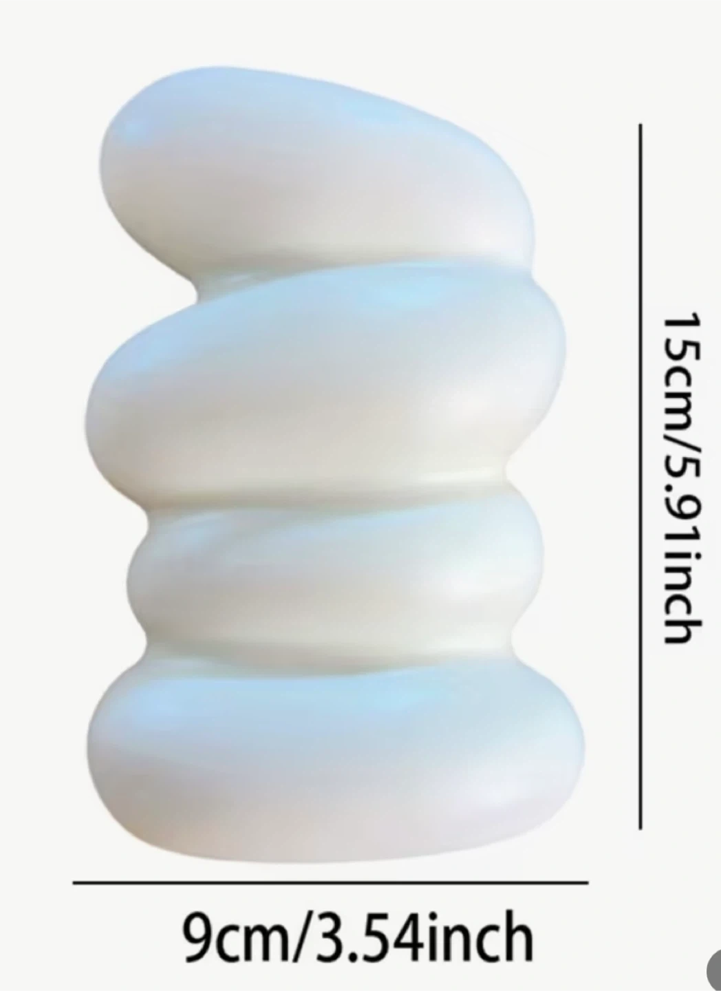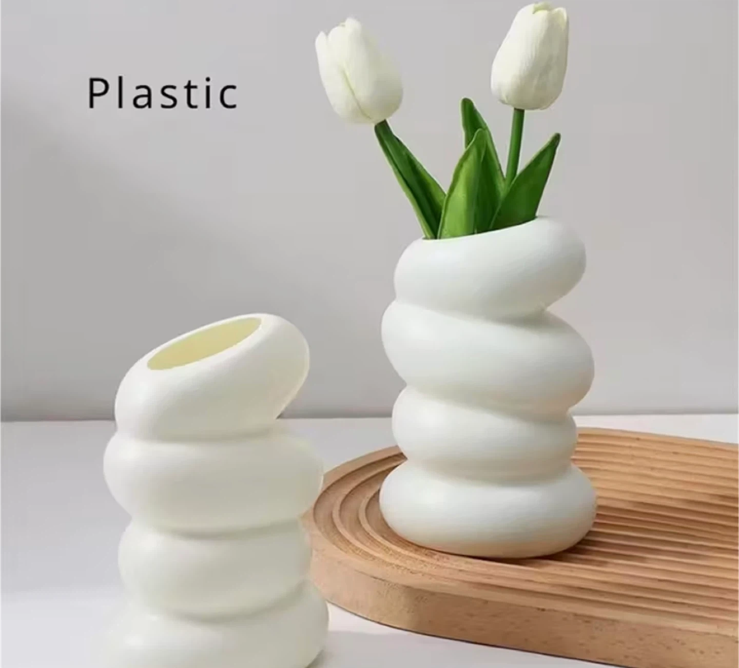 This white vase has a unique bulbous, twisted shape. It's made of plastic and measures 15cm (5.91 inches) tall and 9cm (3.54 inches) wide. It's a stylish decorative piece for your home.