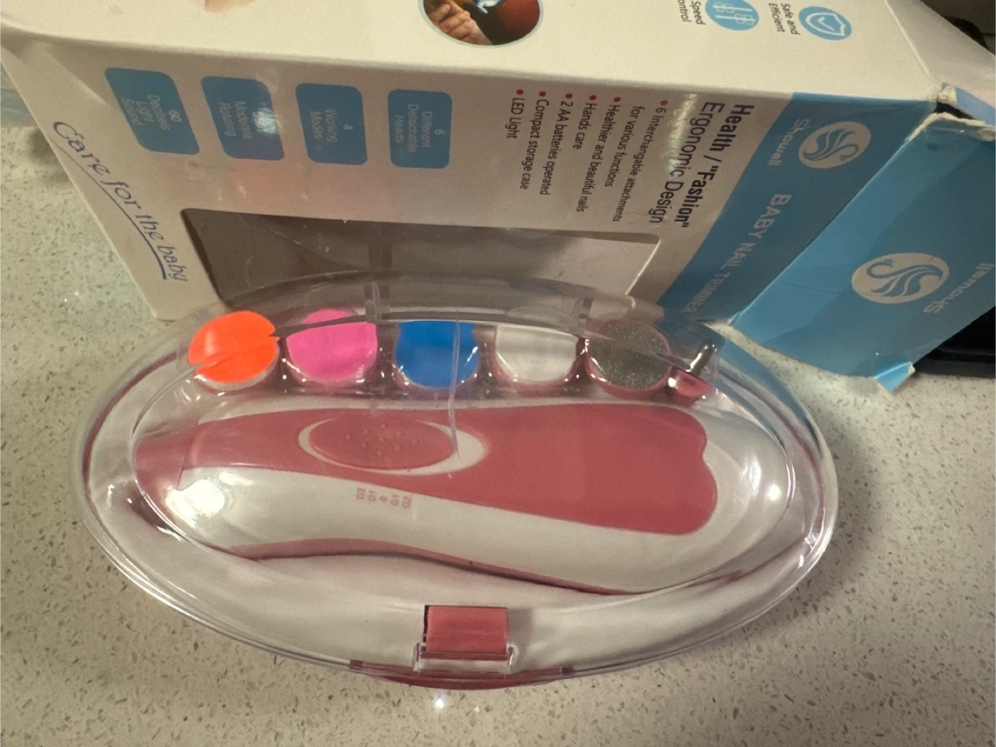 This Showell baby nail trimmer is designed for healthier and beautiful nails. It's ergonomic and comes with 6 interchangeable attachments for various functions. The trimmer is 2 AA batteries operated and includes a compact storage case with an LED light. Never used.