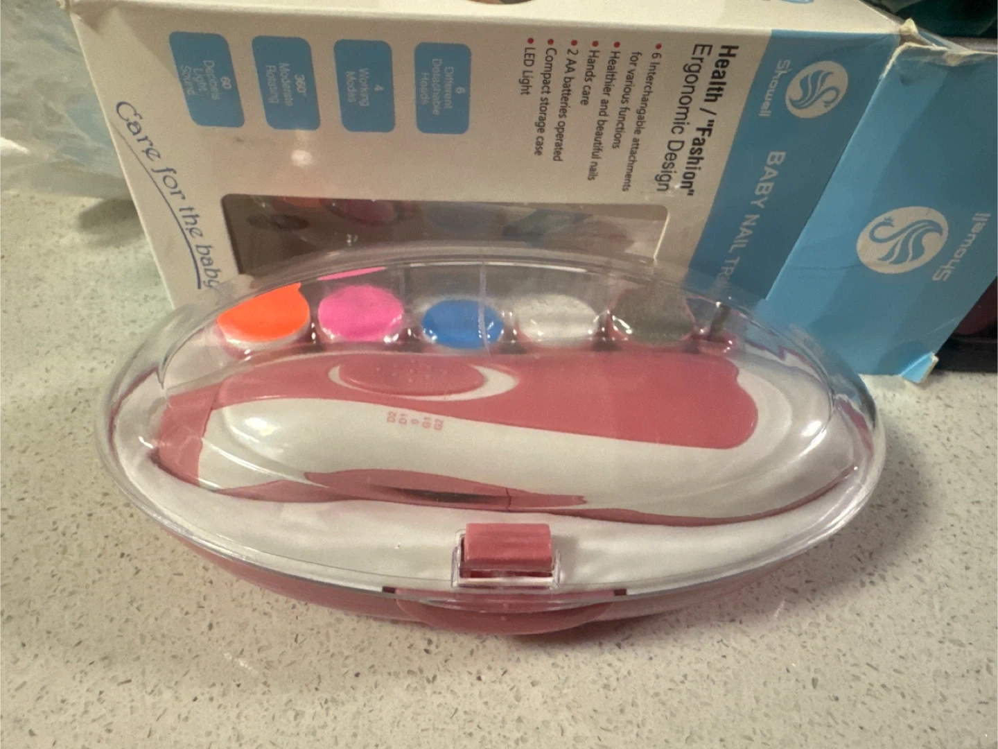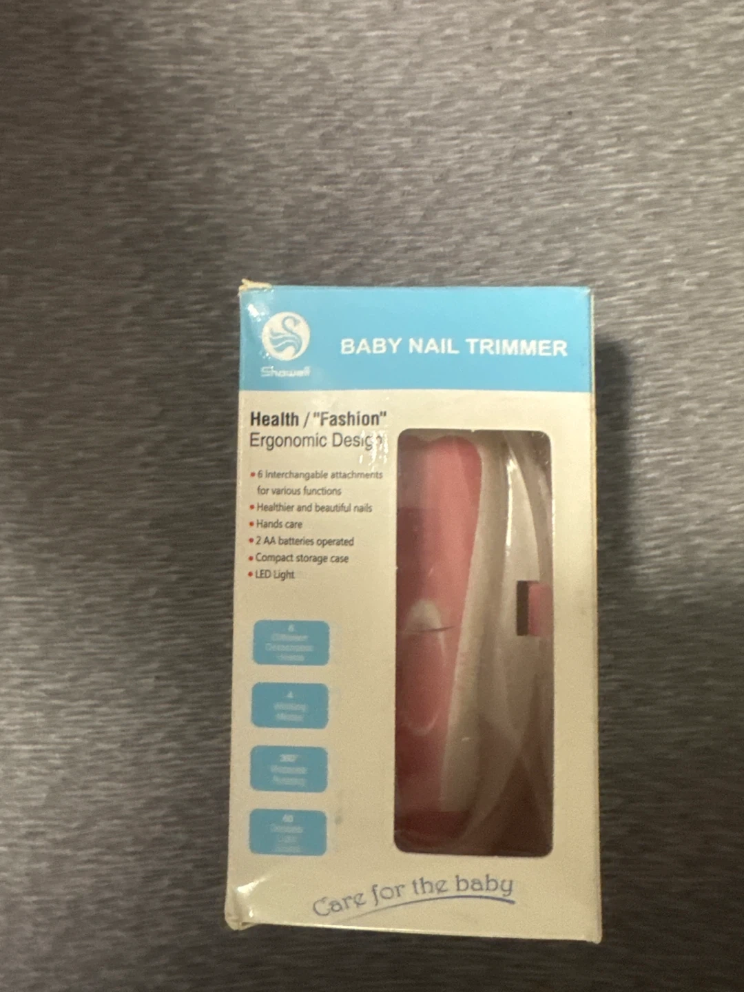 This Showell baby nail trimmer is designed for healthier and beautiful nails. It's ergonomic and comes with 6 interchangeable attachments for various functions. The trimmer is 2 AA batteries operated and includes a compact storage case with an LED light. Never used.