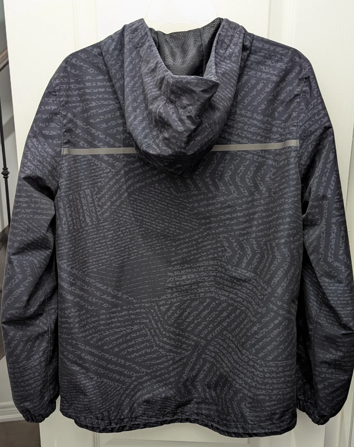 Selling a unisex rain coat in great condition! It's perfect for those windy days or light rain. The jacket has a hood and a stylish pattern, making it both functional and fashionable.