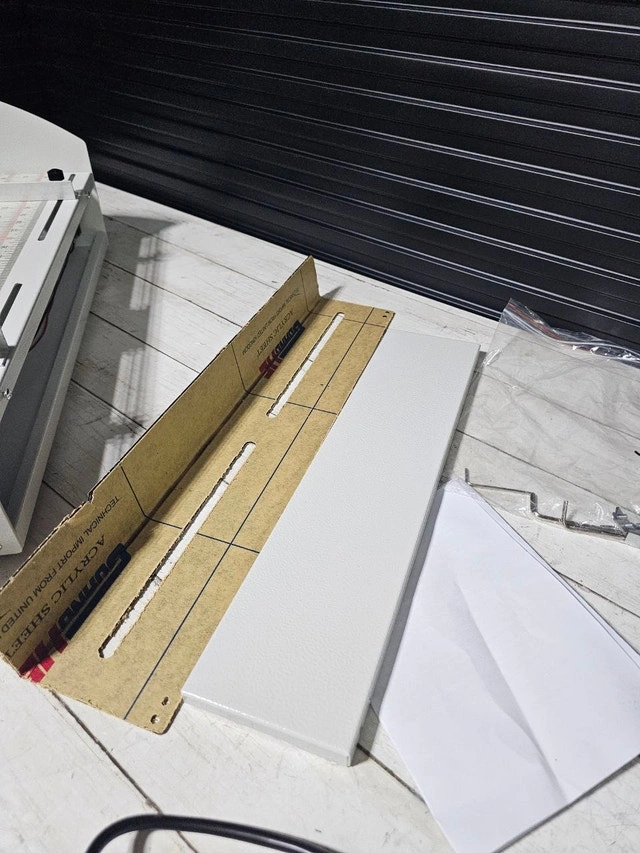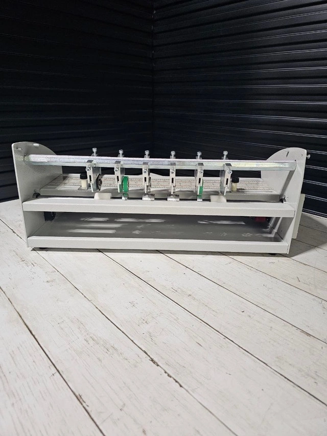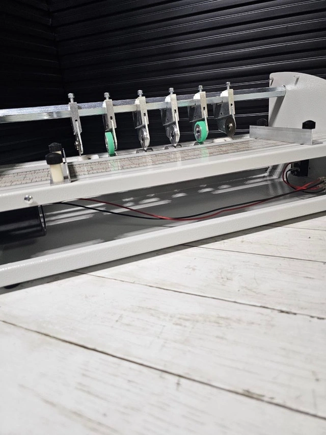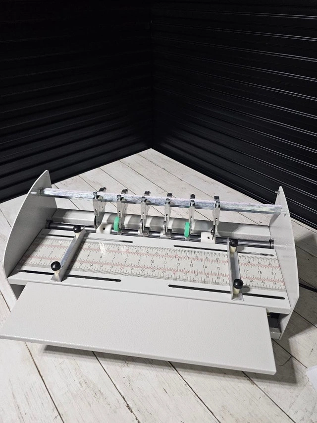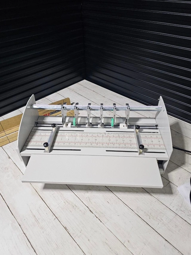 This is a new 3-in-1 electric creasing machine, 18 1/2 inches (470mm) wide. It can score, perforate, and cut paper, making it great for cards, invitations, and tickets. It comes with 3 specialized blades: a creasing blade (adjustable width 1.0/1.2/1.5mm), a perforation blade for dotted lines, and a cutting blade for trimming. It handles paper thicknesses from 60-500 gsm. The machine features a user-friendly design with a hexagonal blade holder for stability and a T-shaped paper feed guide for precise alignment. You can easily adjust blade positioning and height with simple screw adjustments. It's ideal for various projects like greeting cards, menus, and more. The machine operates at 25r/min. This is for sale by owner. Feel free to message if you have any questions!