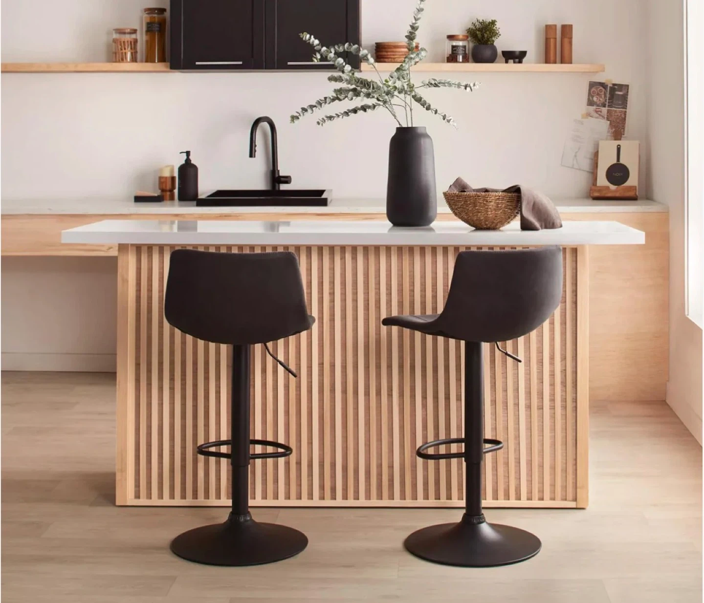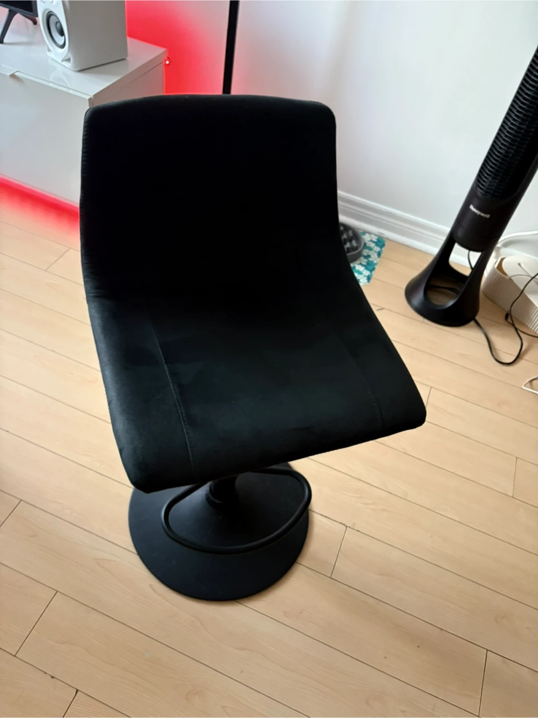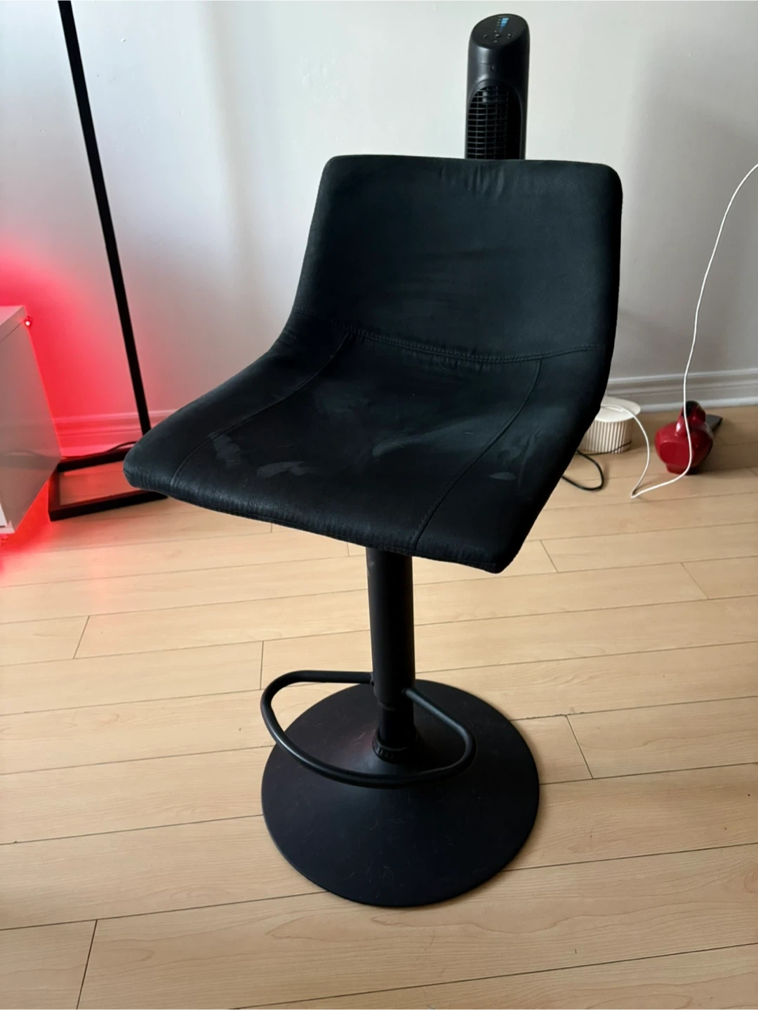 Selling a black adjustable swivel bar stool! It's in good condition and ready to add some style to your kitchen or bar area. The swivel function makes it easy to turn and chat, and the adjustable height lets you customize it to your counter