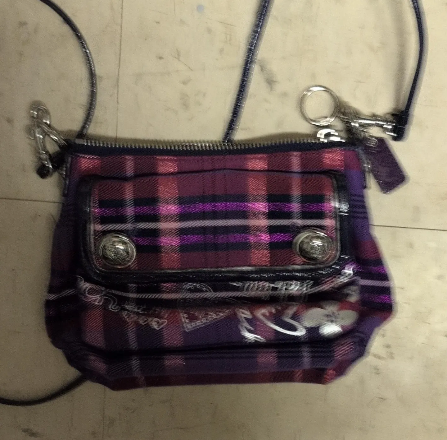 A small Coach crossbody bag with a purple and pink plaid pattern. It has a zip closure and a front flap with button details. The bag comes with a detachable strap and a Coach hang tag.