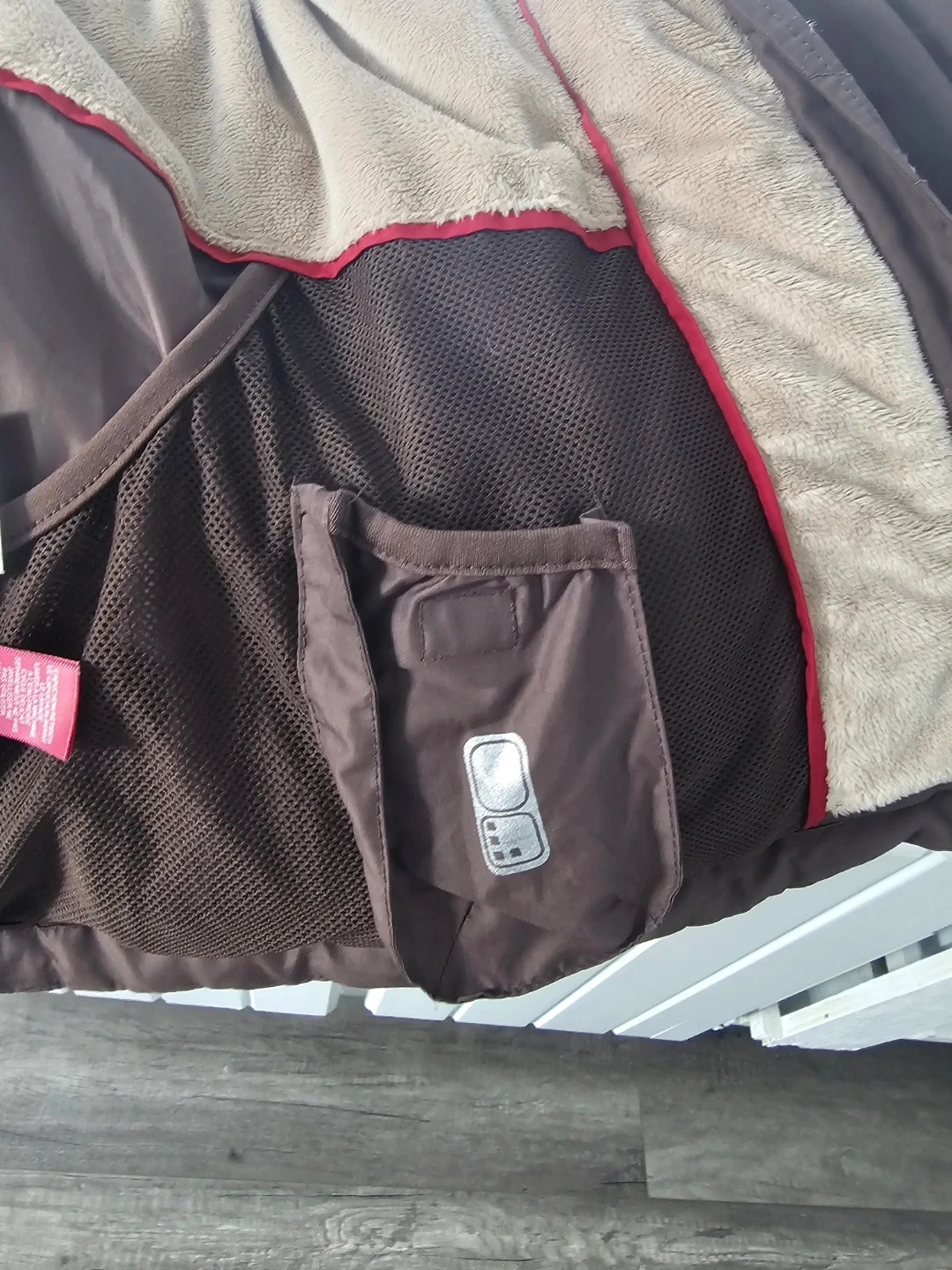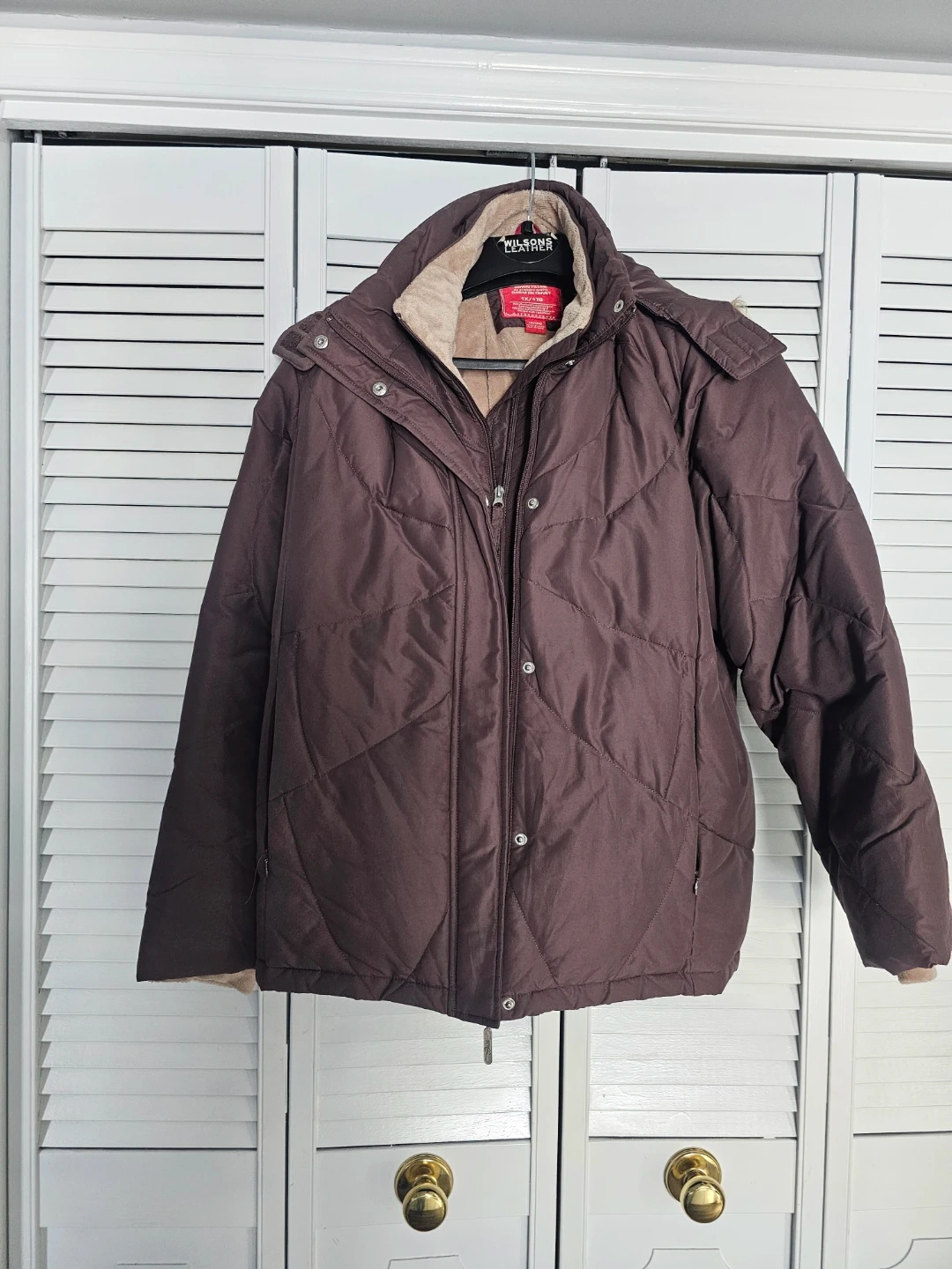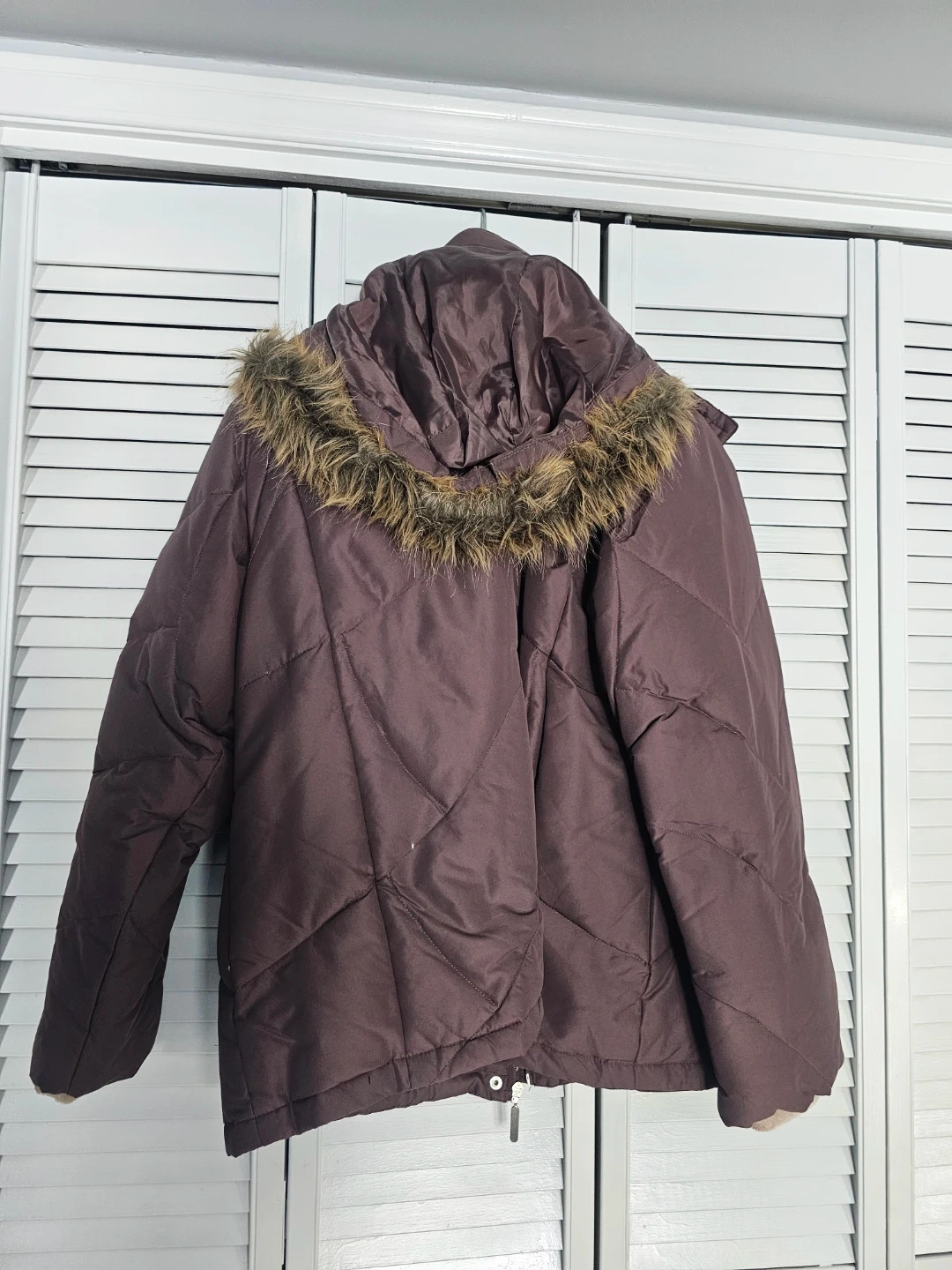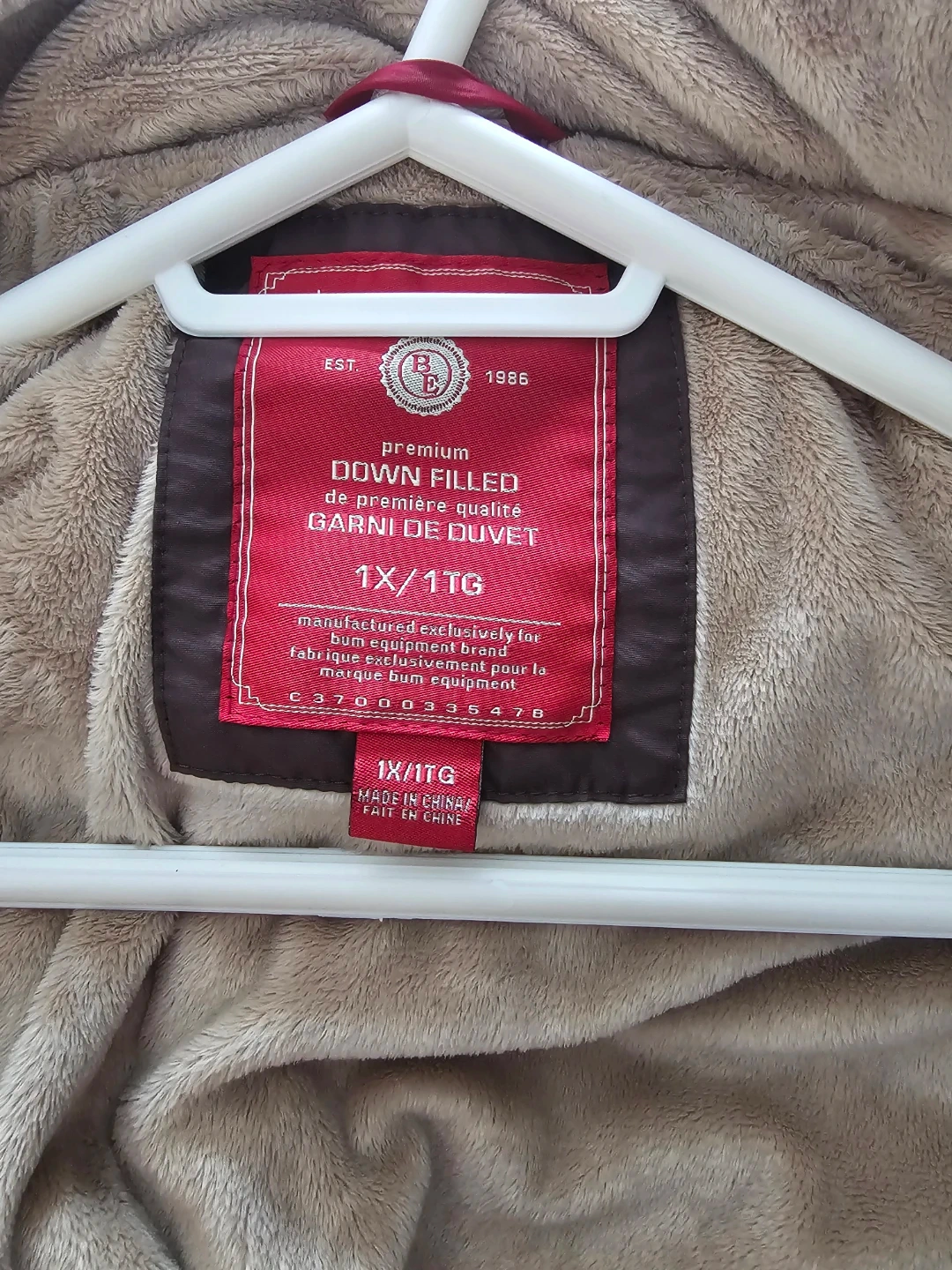 Premium down filled parka jacket with a faux fur lined hood. It's size 1X/1TG and made in China. Features a cozy sherpa lining and multiple interior pockets.