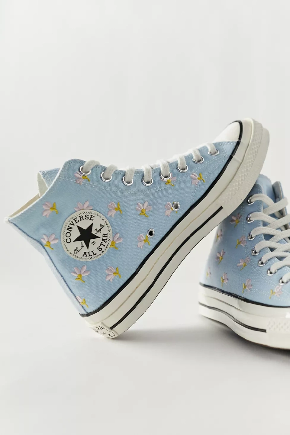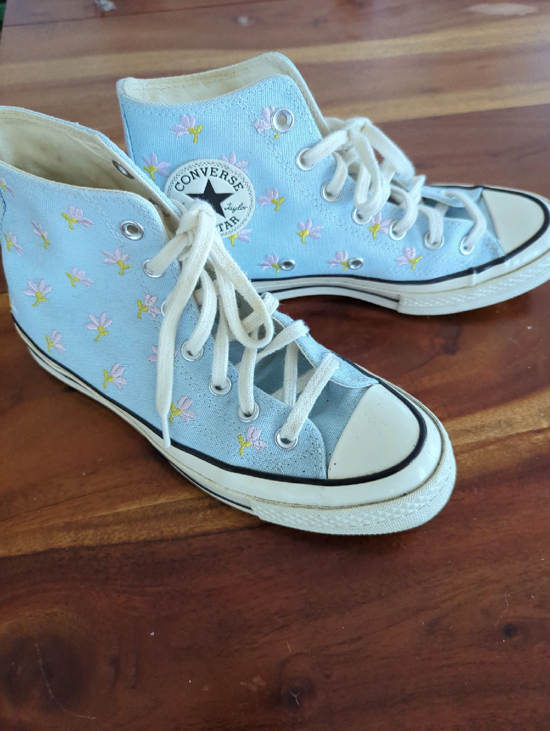 Selling a pair of Converse Chuck Taylor All Star high tops in a lovely light blue colour with floral embroidery! They're in great condition and are a women's US size 7. Perfect for adding a touch of spring to your step!