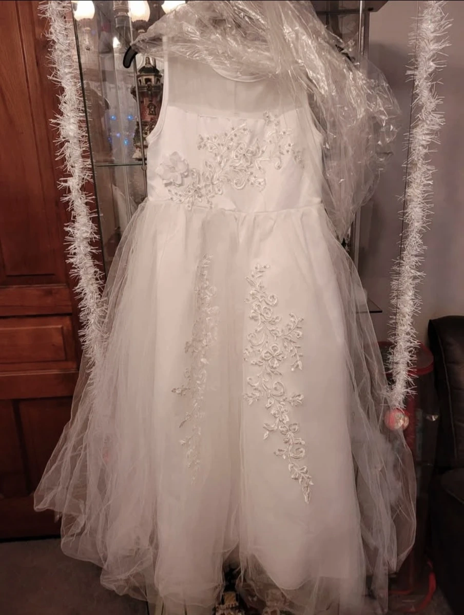 Used for communion .White tulle dress with floral embroidery. Features a round neckline and sleeveless design. Size 10. Perfect for special occasions!