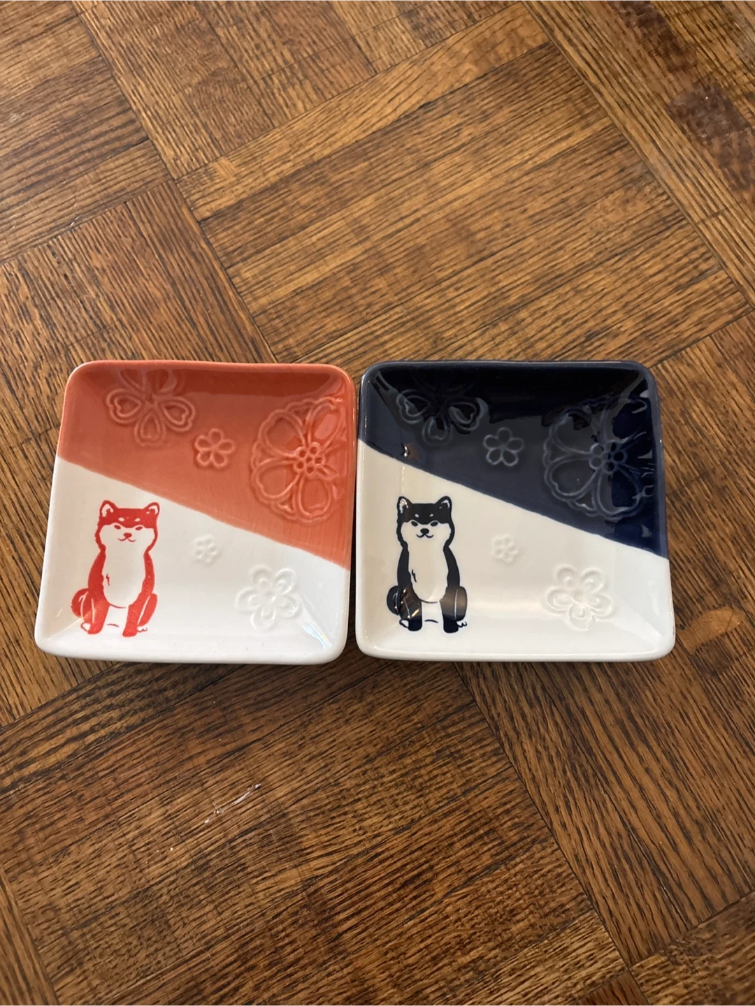 Cute ceramic dishes featuring Shiba Inu designs. One dish is red and white, the other is navy and white. They're perfect for serving small snacks or condiments. Dish material is ceramic.