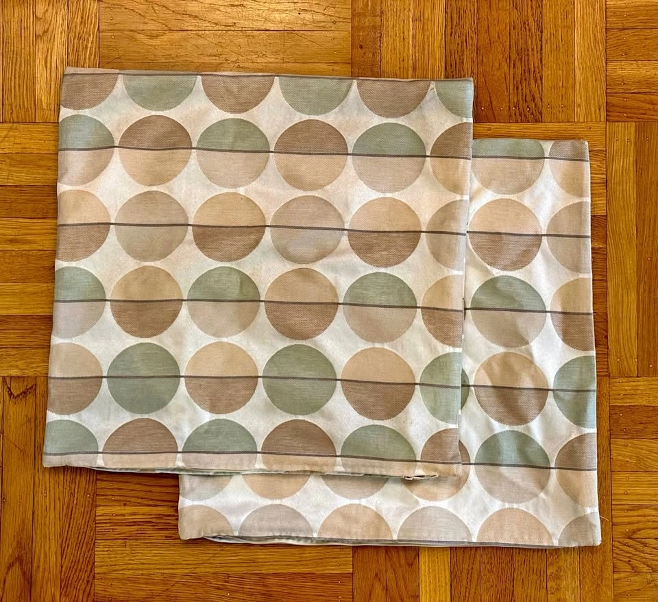Selling a set of 2 matching decorative pillow covers in a modern polka dot pattern. Colors are sage green, tan, and brown on a cream/off-white background. Covers are in good condition with no rips, stains, or tears. 62% cotton and 38% polyester.