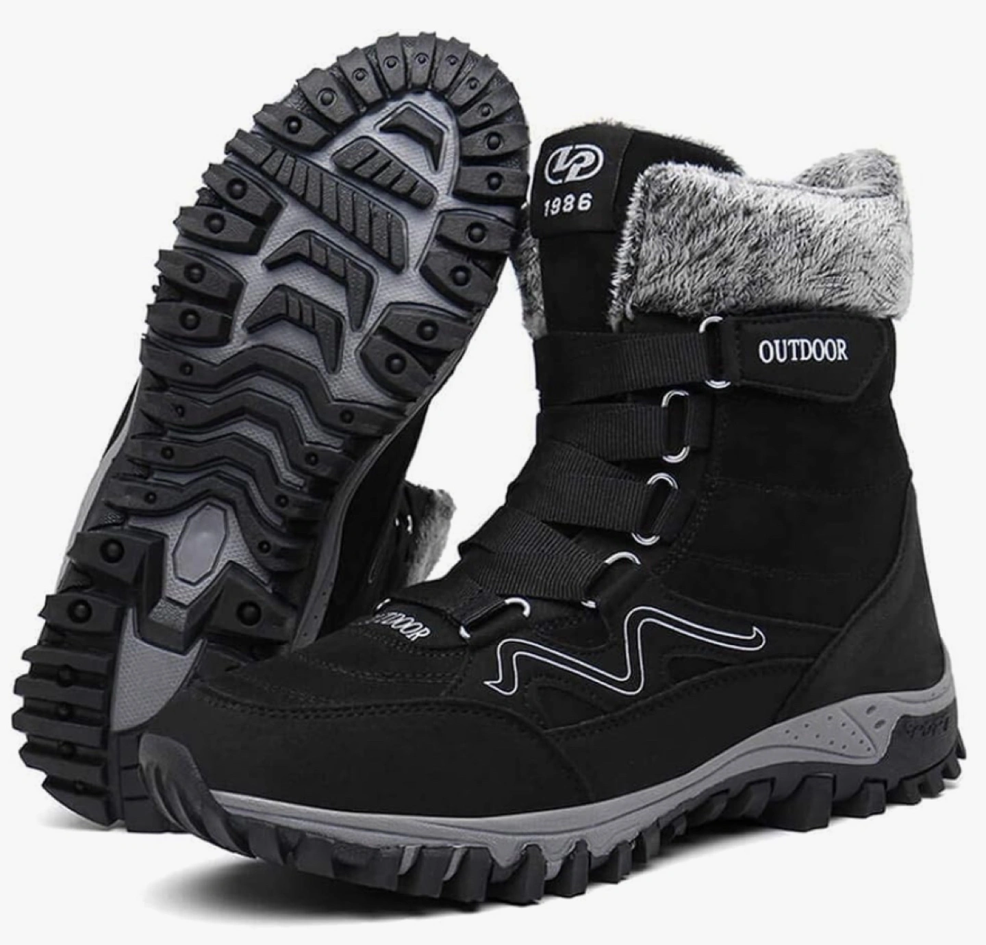 Black winter boots with fur lining. Outdoor wear, lace-up style.