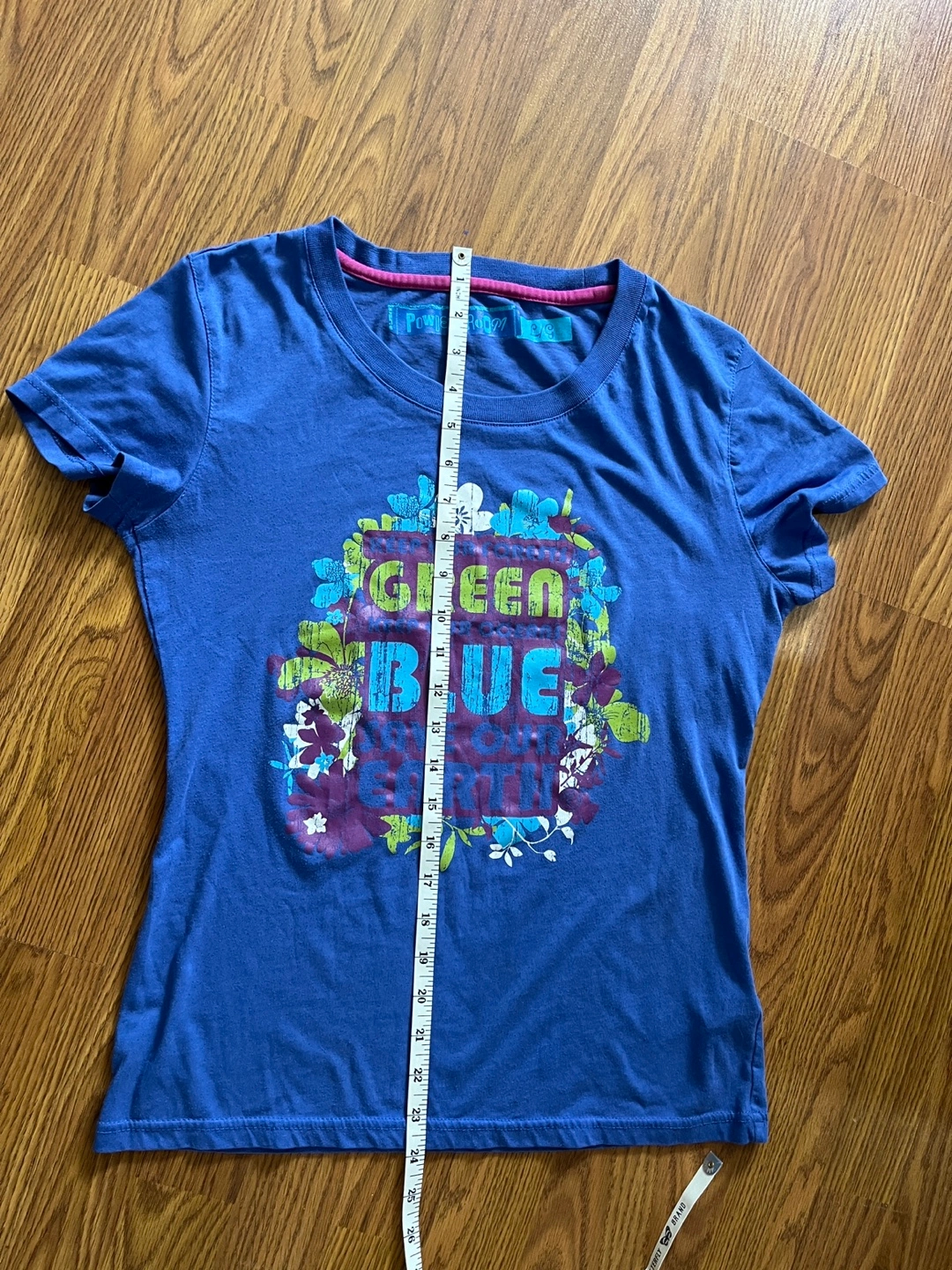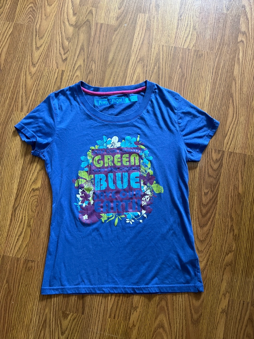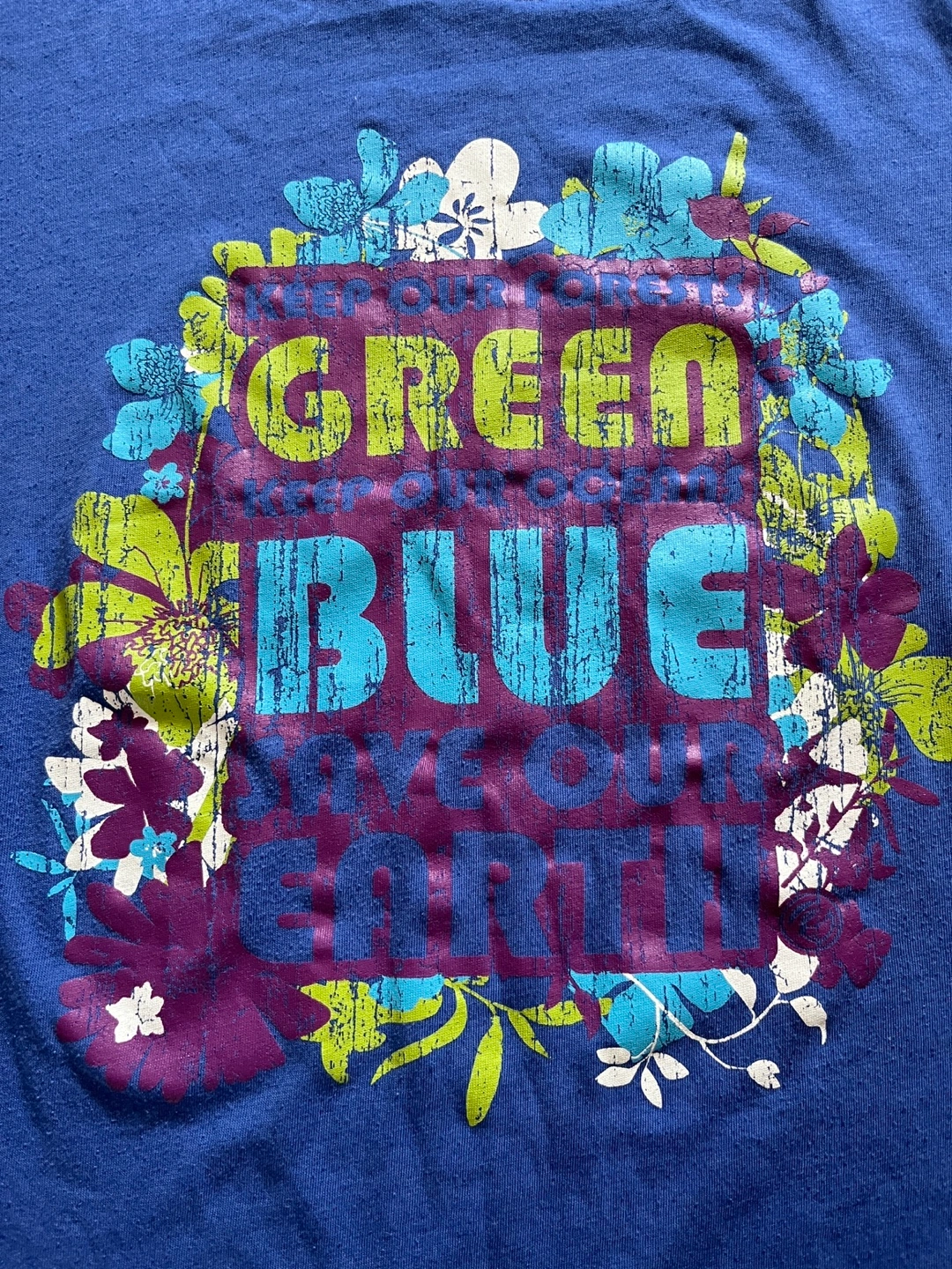 Powder Room women’s graphic t-shirt with a vibrant “Green Blue Save Our Earth’ print surrounded by colorful floral accents. Labeled a size large, but fits more like a small to medium (please check measurements). Made from a soft fabric in a bold royal blue color. Great for casual wear, skate/surf inspired outfits, earth-themed events, layering or Y2K/eco-style looks. In excellent pre-owned condition.