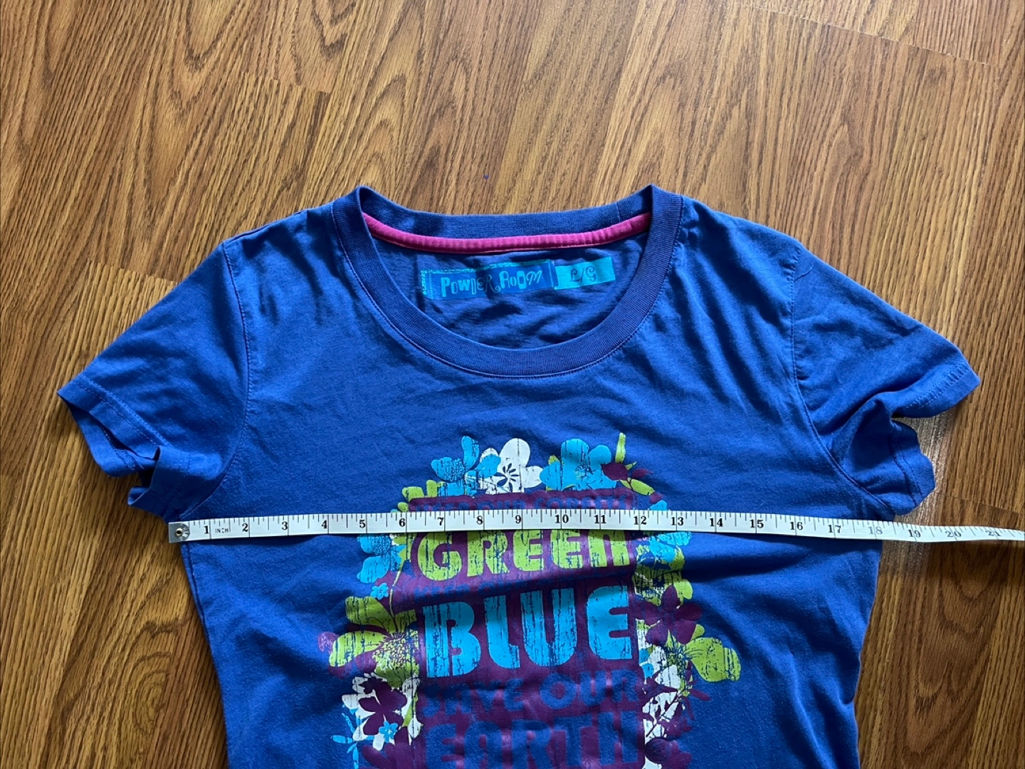 Powder Room women’s large graphic tee, green blue, runs small