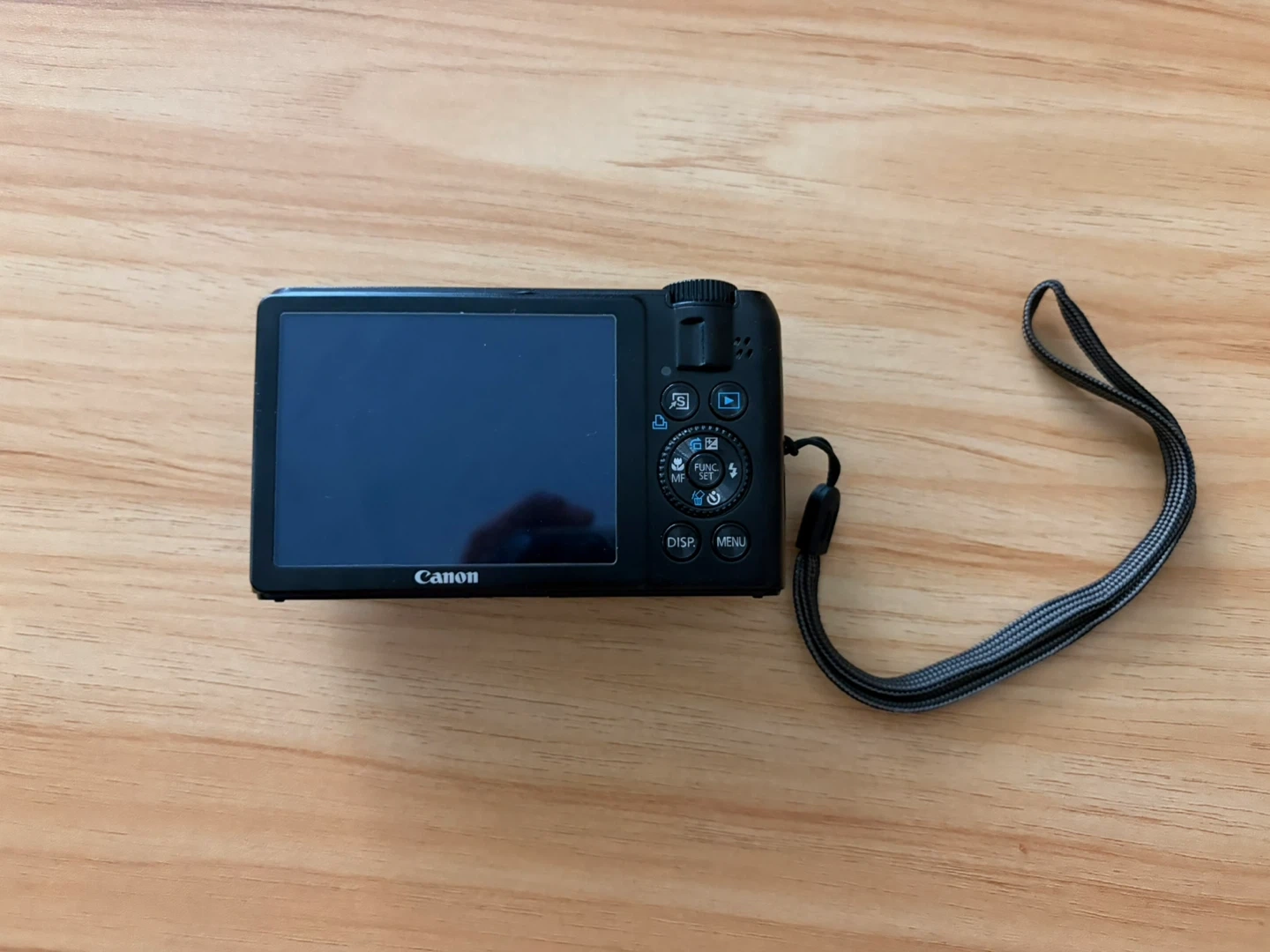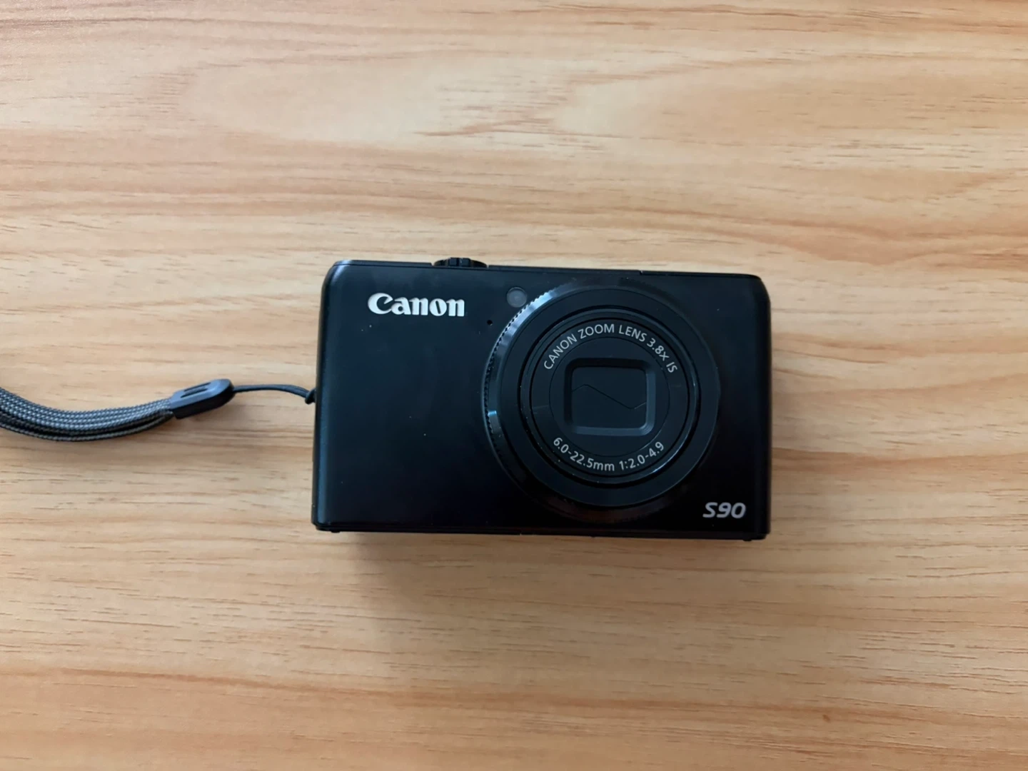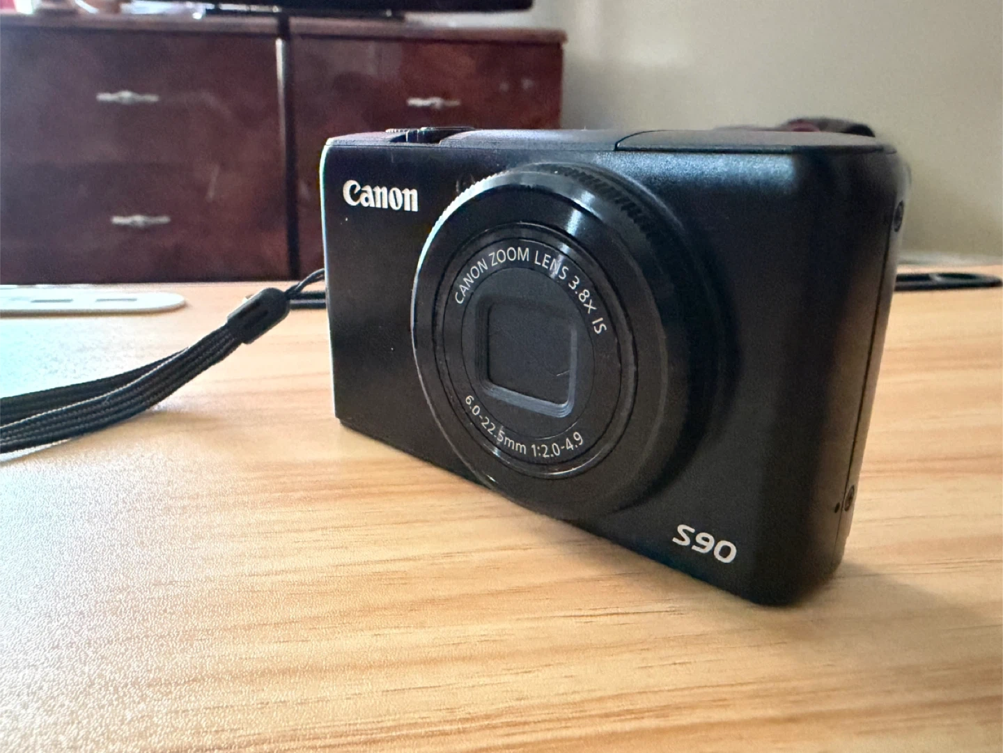 Canon PowerShot S90 digital camera. Features a 3.8x optical zoom lens and a wrist strap. Captures clear photos with its compact design.