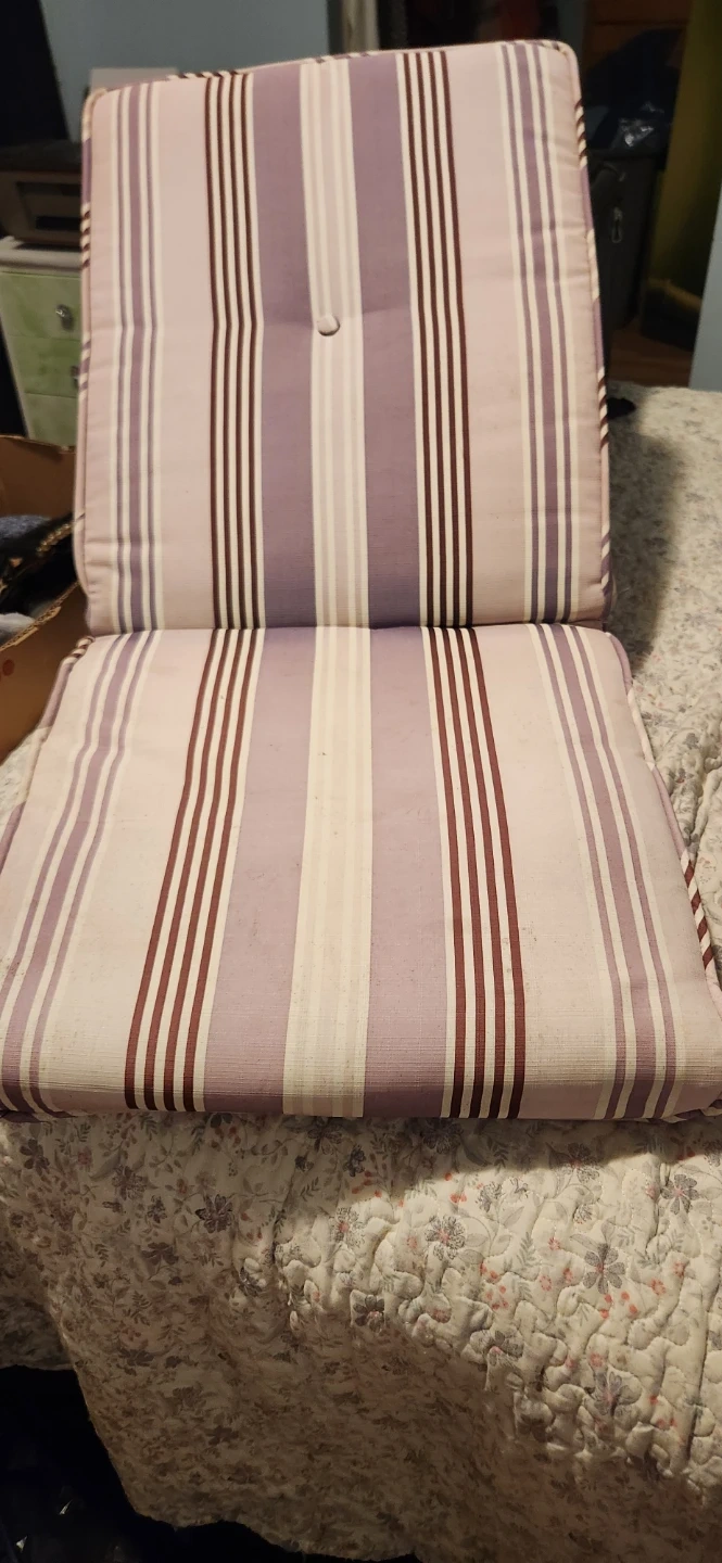 This is a striped seat cushion and back rest set. It's suitable for outdoor chairs or benches. The fabric is durable and the stripes are in shades of purple and brown.