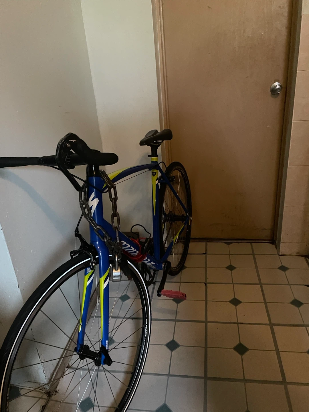 Selling a Specialized road bike in blue and yellow. It shows some signs of use but is still in good condition for riding around town. Perfect for someone looking for a reliable bike!
