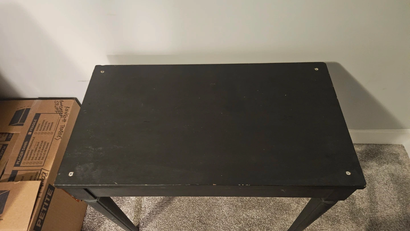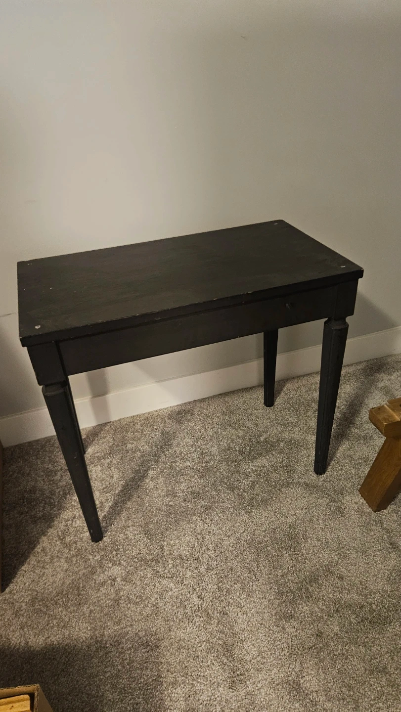 This is a simple black wooden side table. Legs are tapered for a classic look. Works well as a piano bench. (Maybe that's what it is) π€