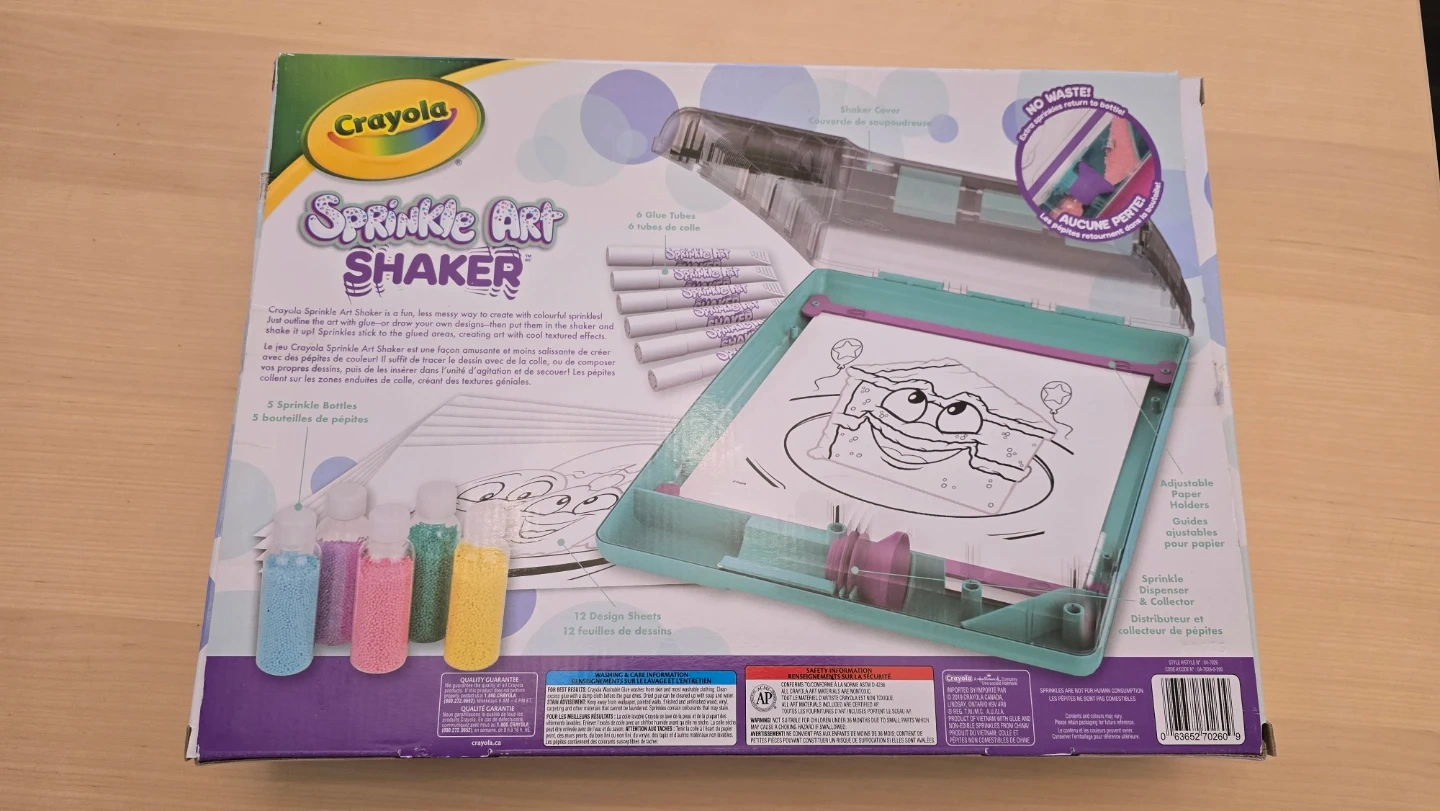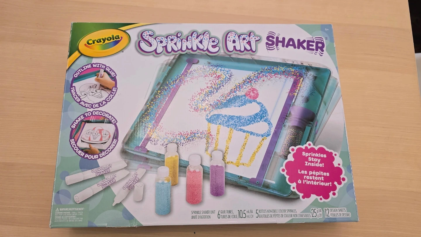 Crayola Sprinkle Art Shaker kit. Includes 5 sprinkle bottles with glitter and 12 design sheets. Shake art fun with colourful sprinkles!