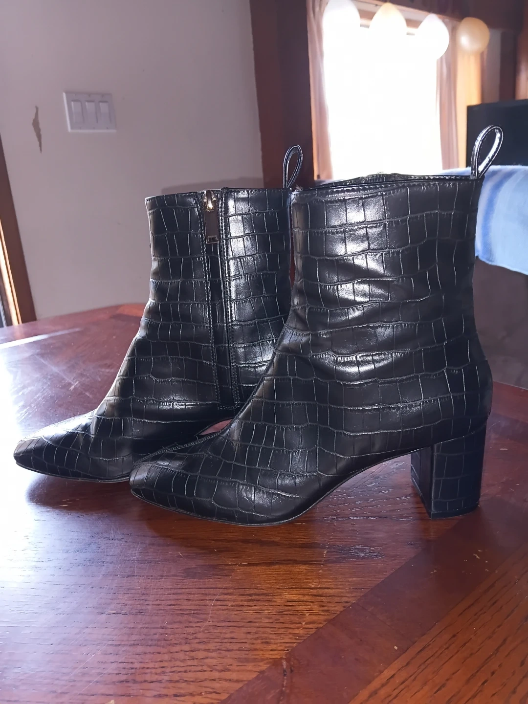 Stylish black ankle boots with a faux crocodile texture and a comfortable block heel. Features a side zipper for easy on and off. These boots are a versatile addition to any wardrobe! Size 8 but fits more like a 7. Bought them off Facebook but they are too small for me so I am reselling to get my money back. I bought them for $30. Reselling for only $20.