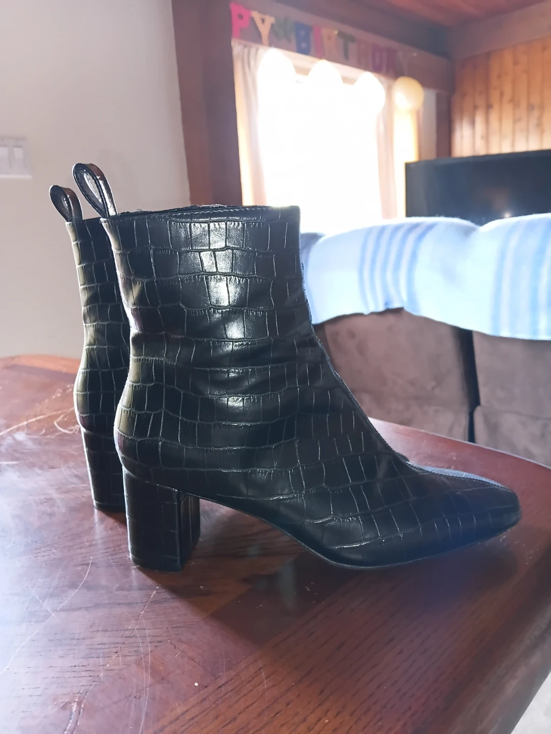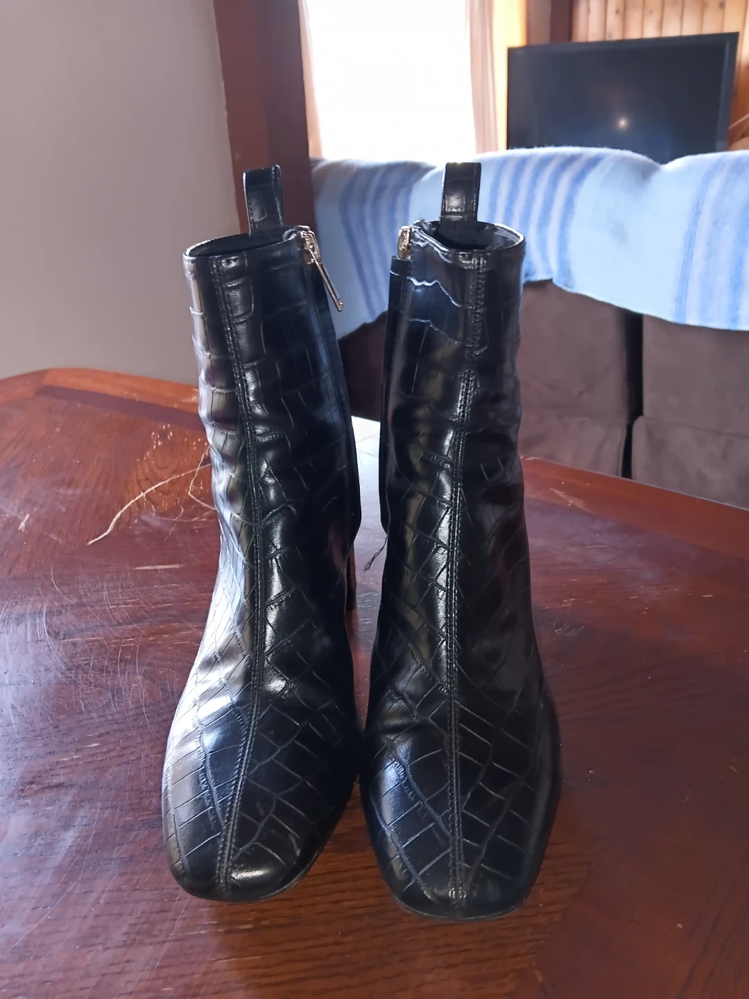 Stylish black ankle boots with a faux crocodile texture and a comfortable block heel. Features a side zipper for easy on and off. These boots are a versatile addition to any wardrobe! Size 8 but fits more like a 7. Bought them off Facebook but they are too small for me so I am reselling to get my money back. I bought them for $30. Reselling for only $20.