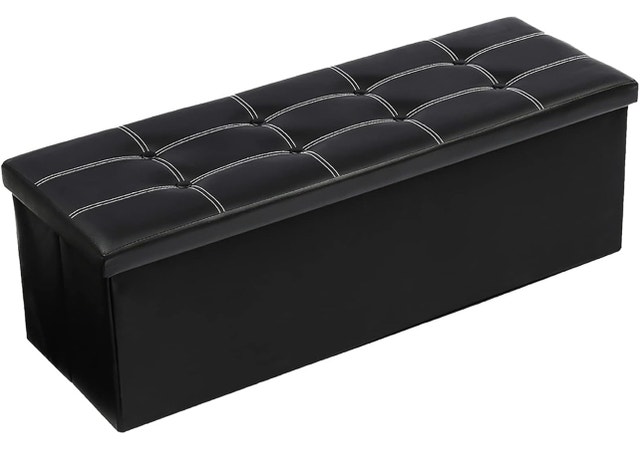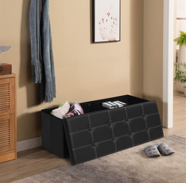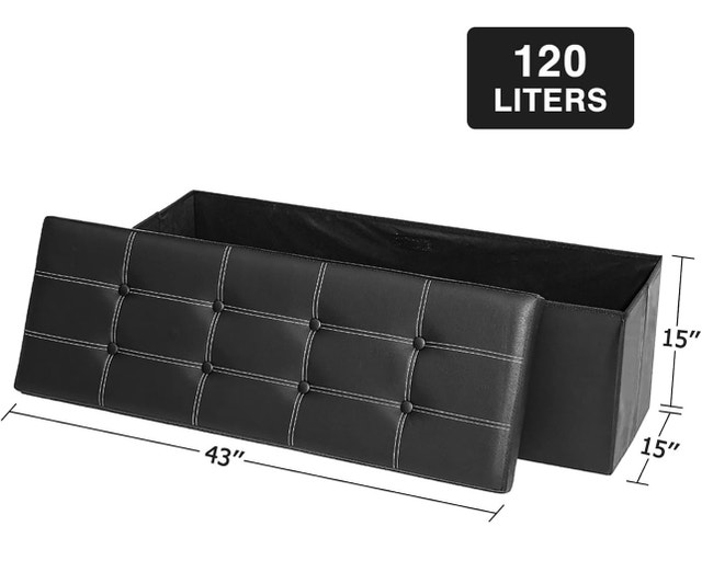 This new 43-inch folding storage ottoman bench features a sleek black leather exterior, perfect for adding style and functionality to any room. With ample storage space and a comfortable cushioned top, this bench is ideal for decluttering and providing extra seating. Dimensions: 43 inches in length. Material: Leather. Colour: Black. Folding design for easy storage. Spacious interior for storing blankets, pillows, toys, and more. This snazzy storage ottoman is looking for a new home! If the ad is up, it's available, so don't hesitate to reach out!