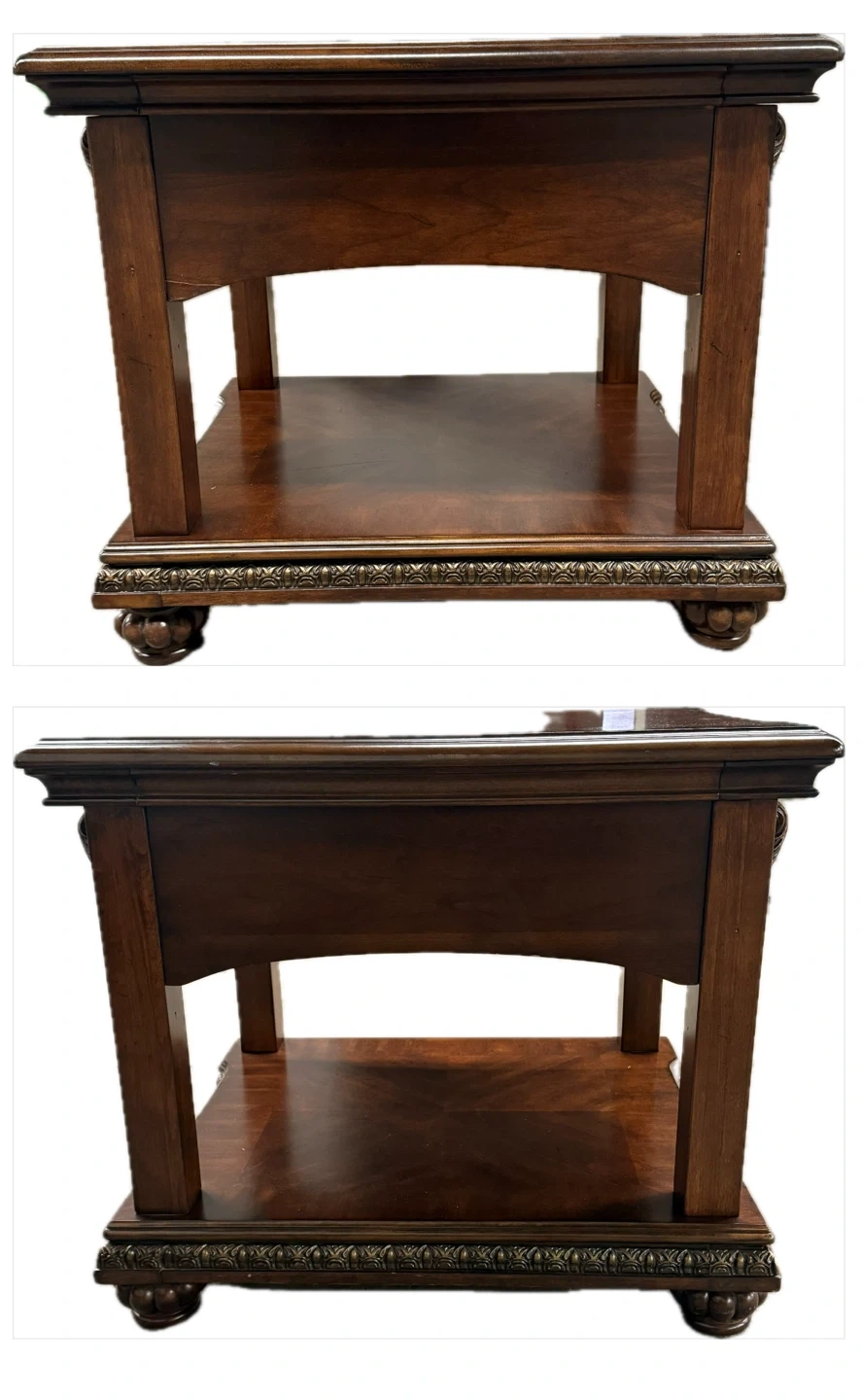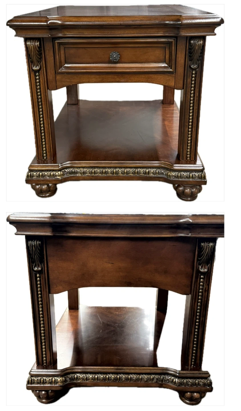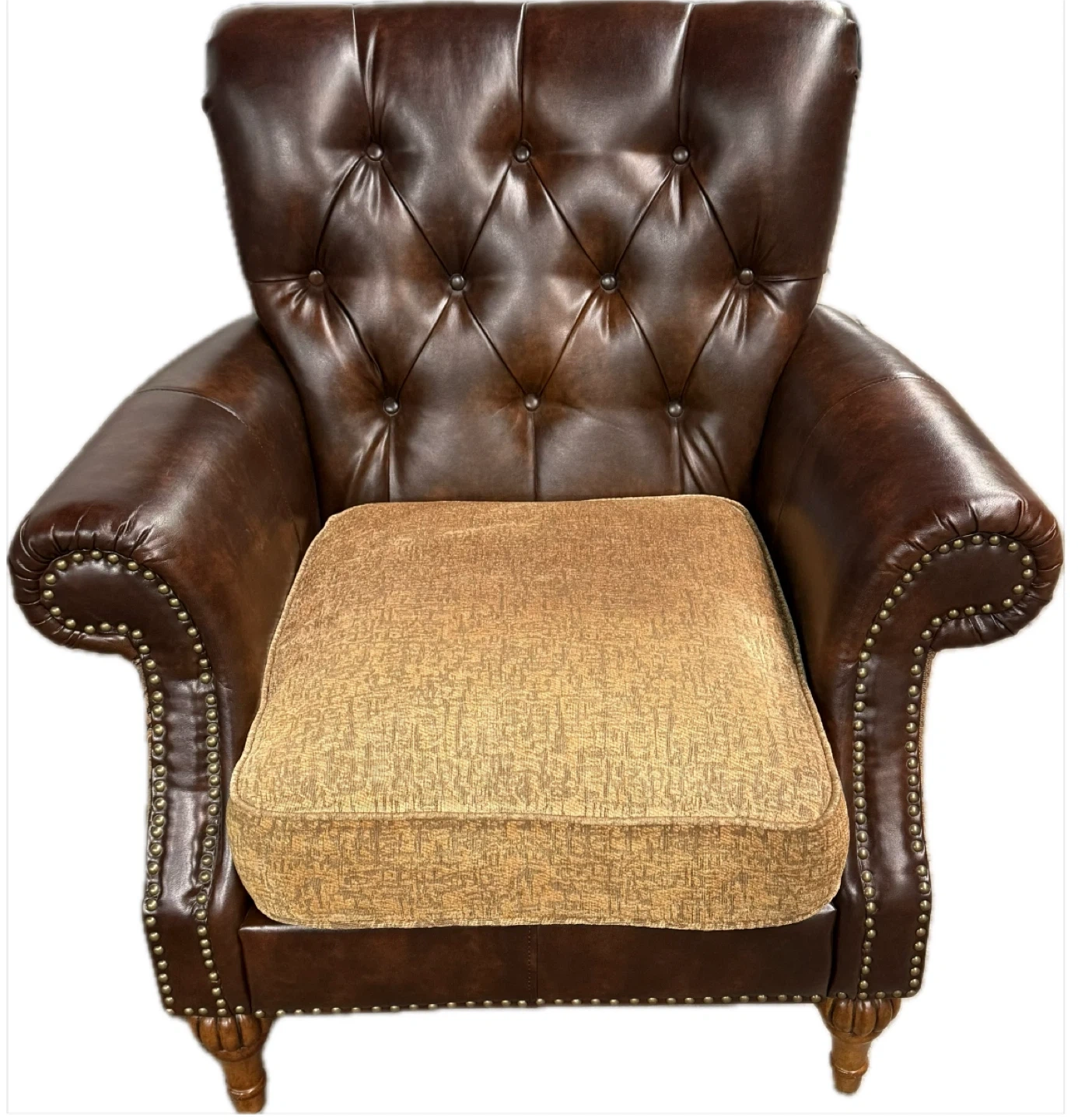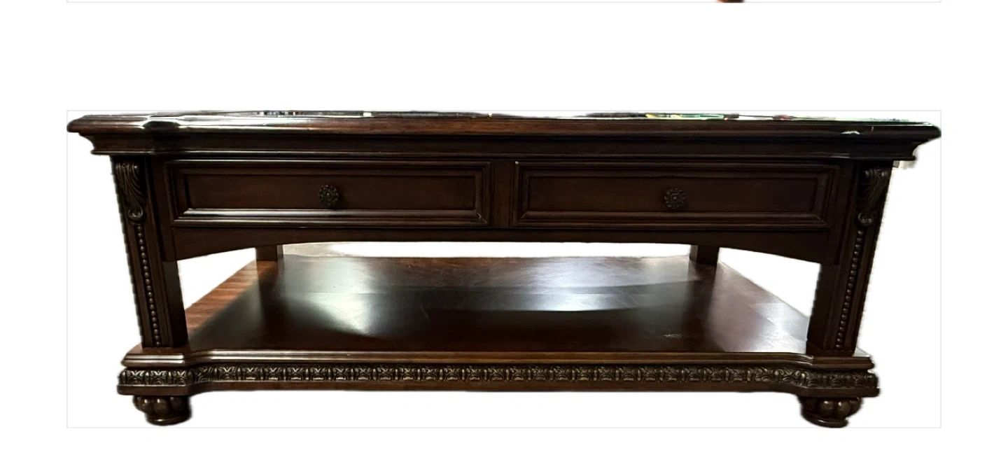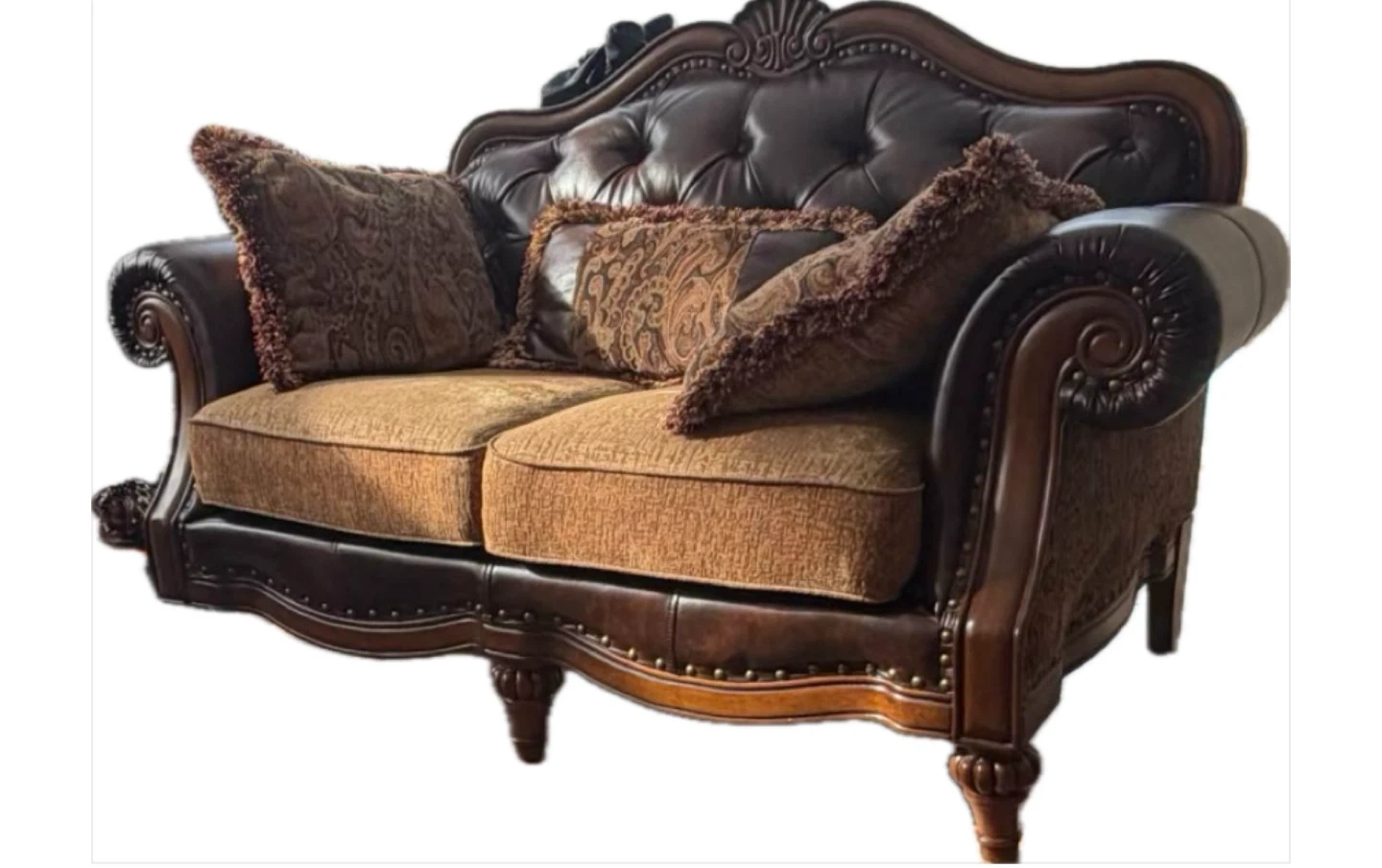 Elegant living room set featuring a love seat and armchair upholstered in rich brown leather and ornate paisley fabric. Includes accent pillows. Matching wooden coffee table with two drawers. Beautifully detailed. 93” Sofa is SOLD!!!!
