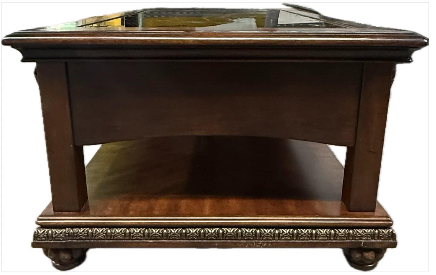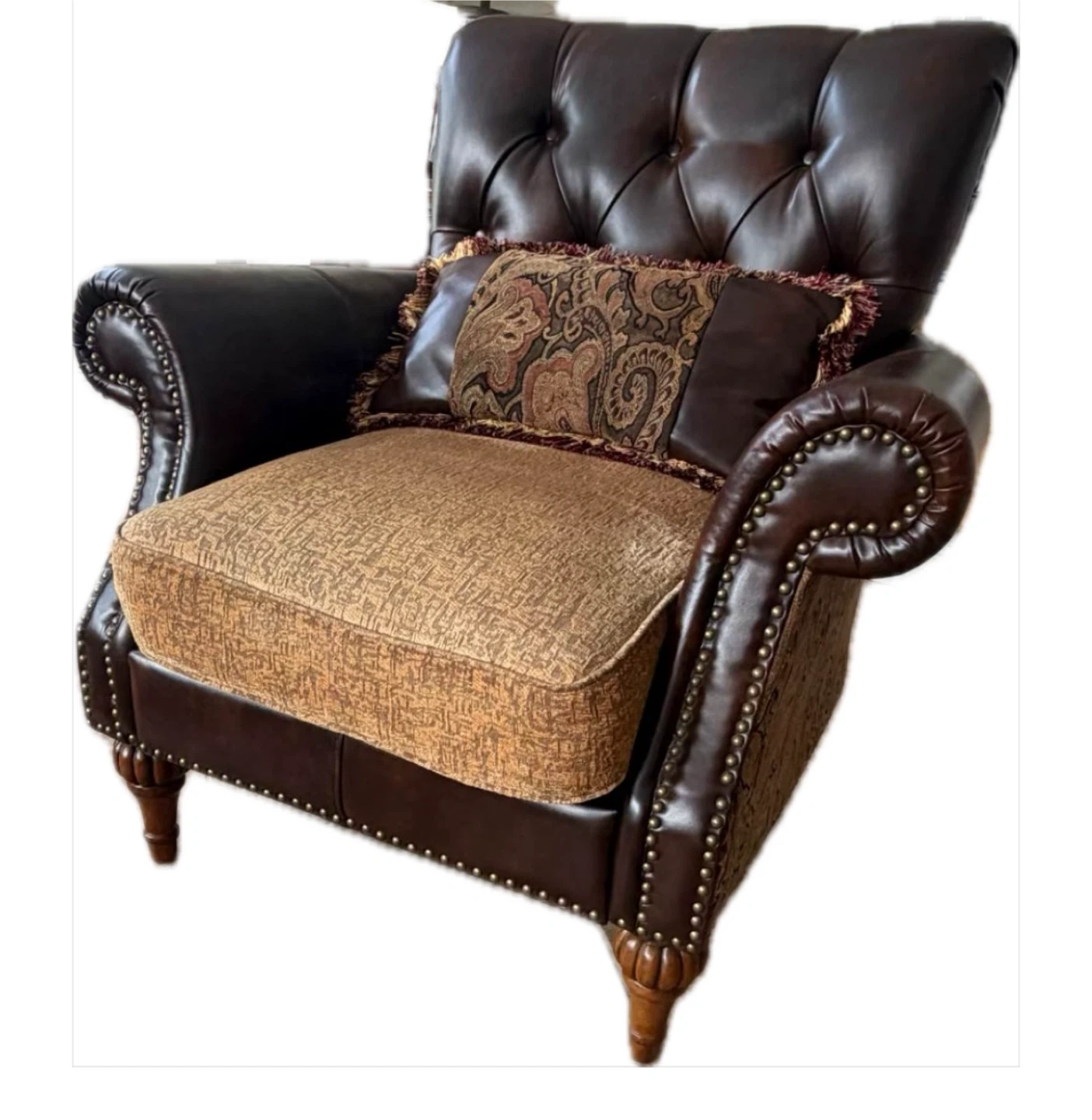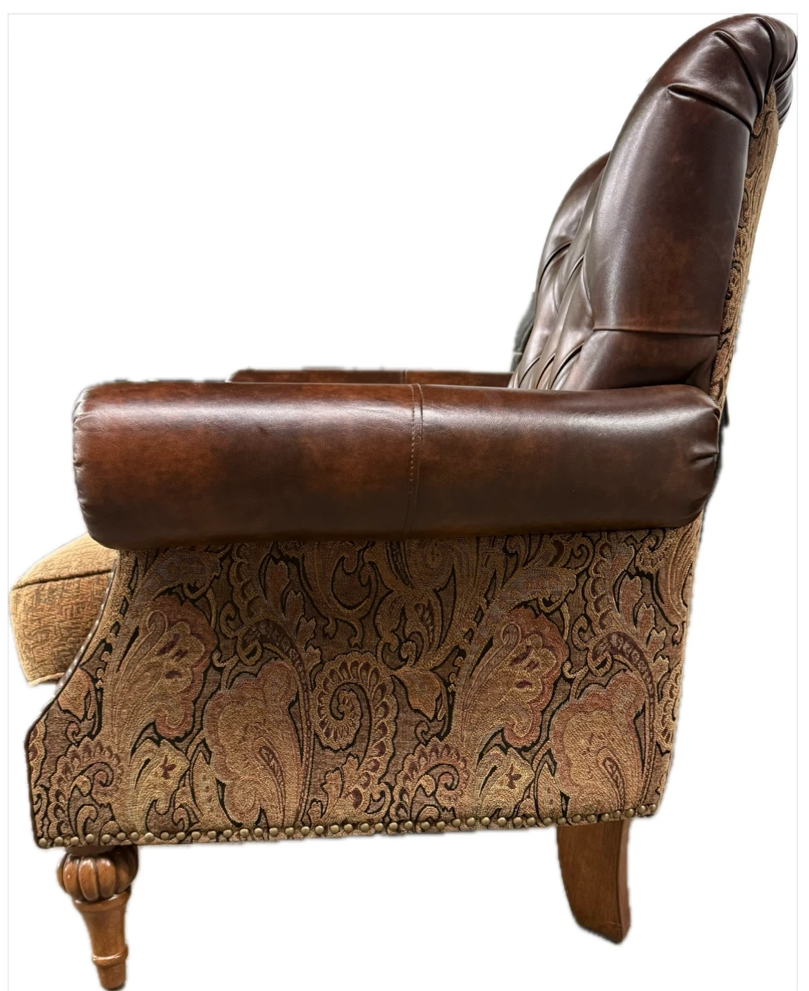 Elegant living room set featuring a love seat and armchair upholstered in rich brown leather and ornate paisley fabric. Includes accent pillows. Matching wooden coffee table with two drawers. Beautifully detailed. 93” Sofa is SOLD!!!!